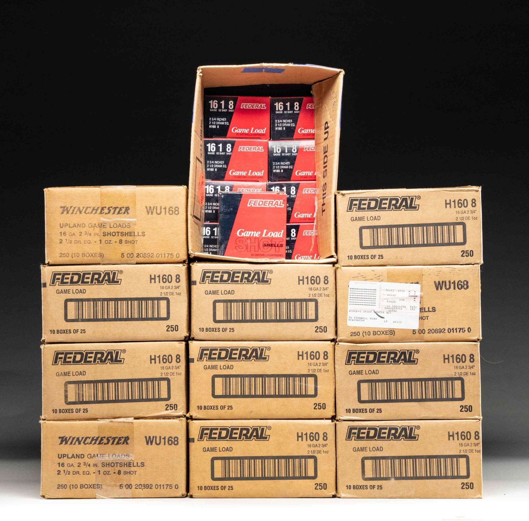 AND 3 WINCHESTER. 11 sealed cases of Federal 16 gauge with stock number "H160 8" plus 9 extra boxes (2,975 rounds total). Case lengths of 2 3/4", 2 1/2 Dram equivalence plus 1 oz. of #8 shot. / 3 cases of Winchester with stock number WU168 (750 rounds) having 2 3/4" case lengths, 2 1/2 Dram equivalence and 1 oz. of #8 shot. PROVENANCE: Estate of Lloyd Robinson. (02-26049-3/NW). $850-1,100.