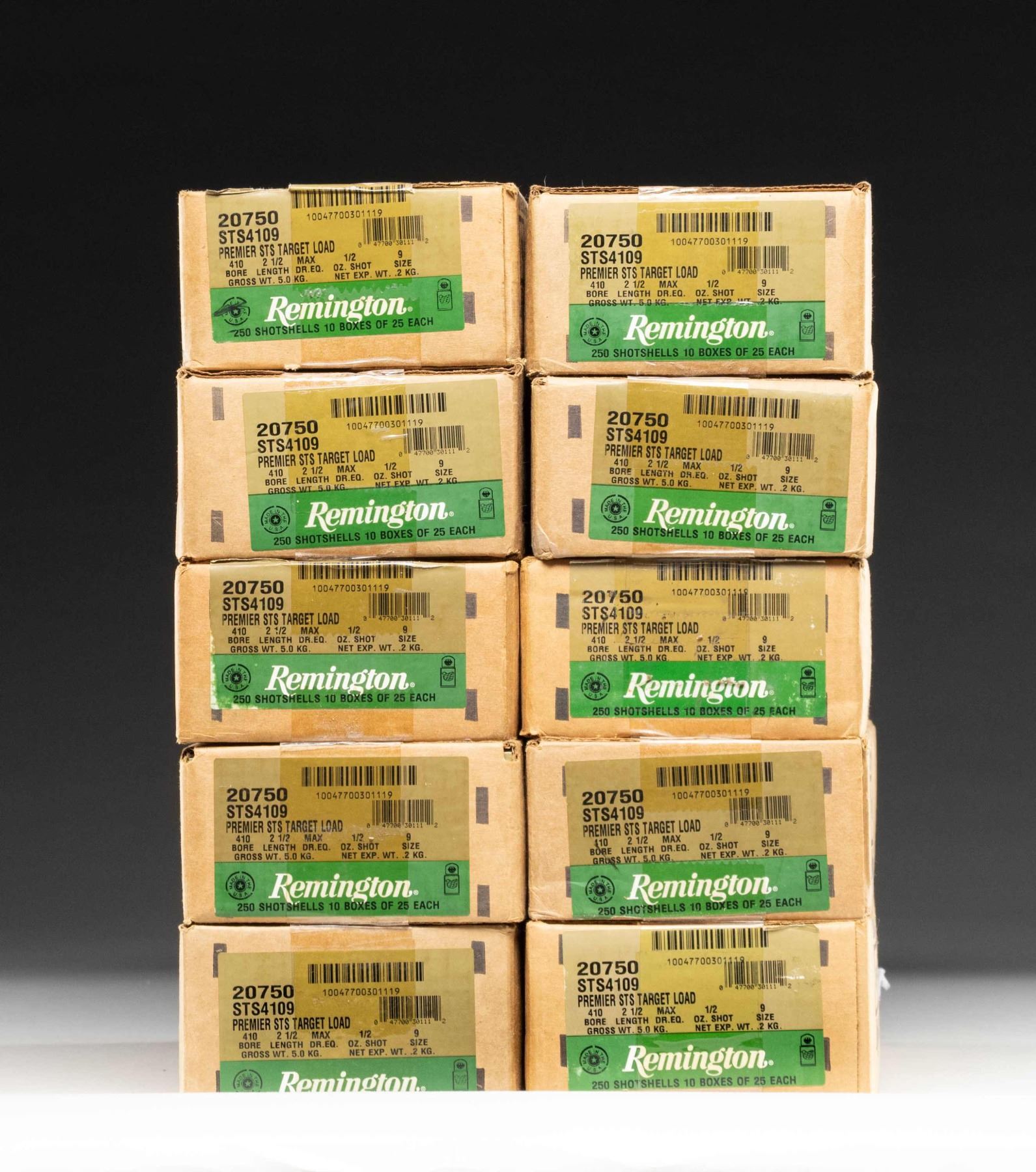 410 GA. TARGET AMMO. 10 sealed cases (2,500 rounds) of Remington 410 gauge Premier STS Target Loads having stock numbers of "20750" and "STS4109". Case length of 2 1/2", Max Dram equivalence plus 1/2 oz. of #9 shot. PROVENANCE: Estate of Lloyd Robinson. (02-26049-11/NW). $700-1,000.