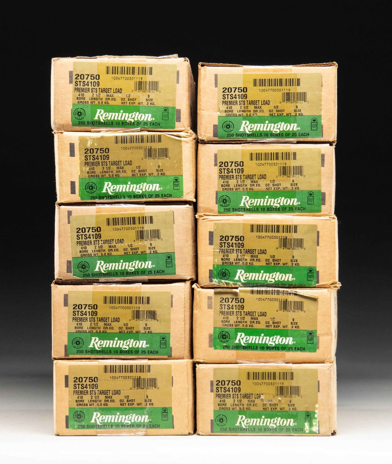 410 GA. TARGET AMMO. 10 sealed cases (2,500 rounds) of Remington 410 gauge Premier STS Target Loads having stock numbers of "20750" and "STS4109". Case length of 2 1/2", Max Dram equivalence plus 1/2 oz. of #9 shot. PROVENANCE: Estate of Lloyd Robinson. (02-26049-12/NW). $700-1,000.