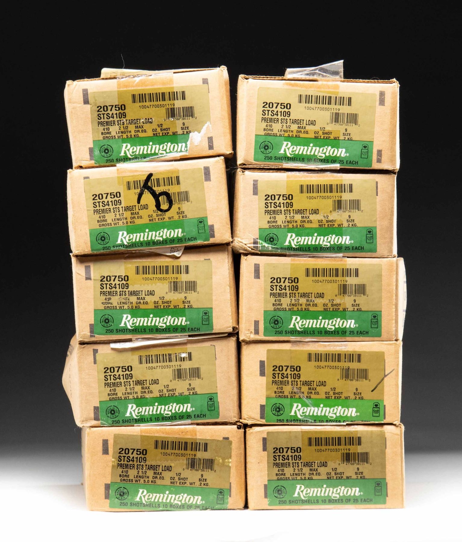 410 GA. TARGET AMMO. 10 sealed cases (2,500 rounds) of Remington 410 gauge Premier STS Target Loads having stock numbers of "20750" and "STS4109". Case length of 2 1/2", Max Dram equivalence plus 1/2 oz. of #9 shot. PROVENANCE: Estate of Lloyd Robinson. (02-26049-13/NW). $700-1,000.