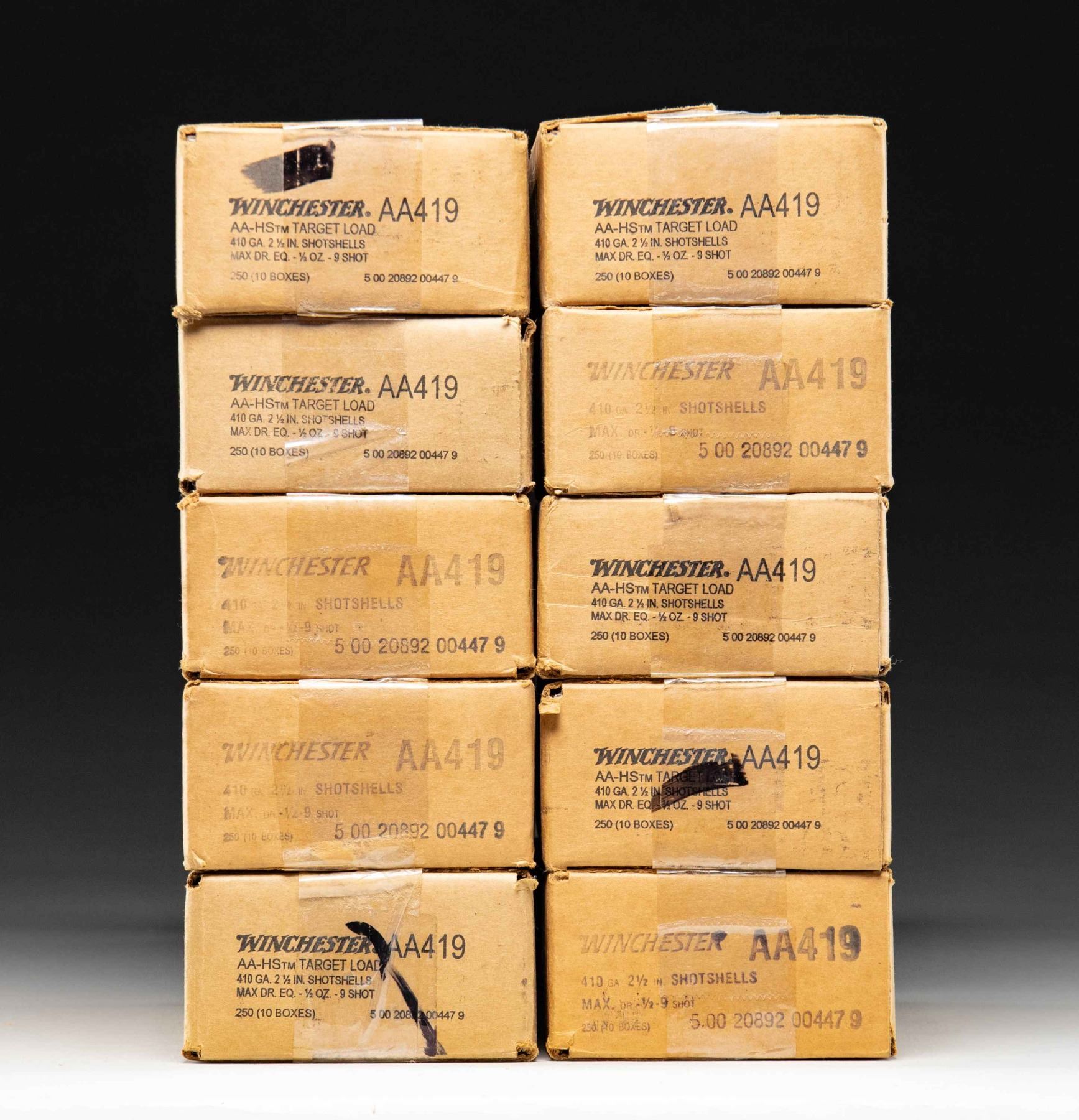 AMMO. 10 sealed cases (2,500 rounds) of Winchester 410 gauge AA-HS Target Loads having stock number "AA419". Case length of 2 1/2", Max Dram equivalence plus 1/2 oz. of #9 shot. PROVENANCE: Estate of Lloyd Robinson. (02-26049-9/NW). $700-1,000.