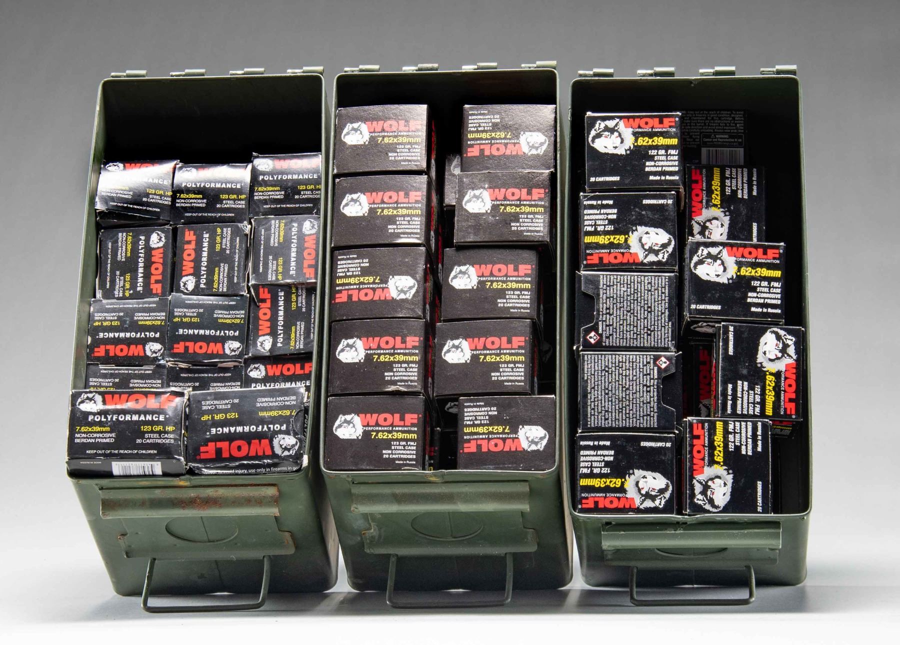 This lot consists of about 2140 rds. of Wolf steel cased 7.62x39. Rds. are a mix of both HP & FMJ. Ammo is in 20 rd. boxes further housed in 50 Cal ammo cans. CONDITION: boxes show varying degrees of wear with some denting on a few boxes. Ammo appears very good to near excellent. (02-25177-10/MJC). AMMO. $500-800 for lot.
