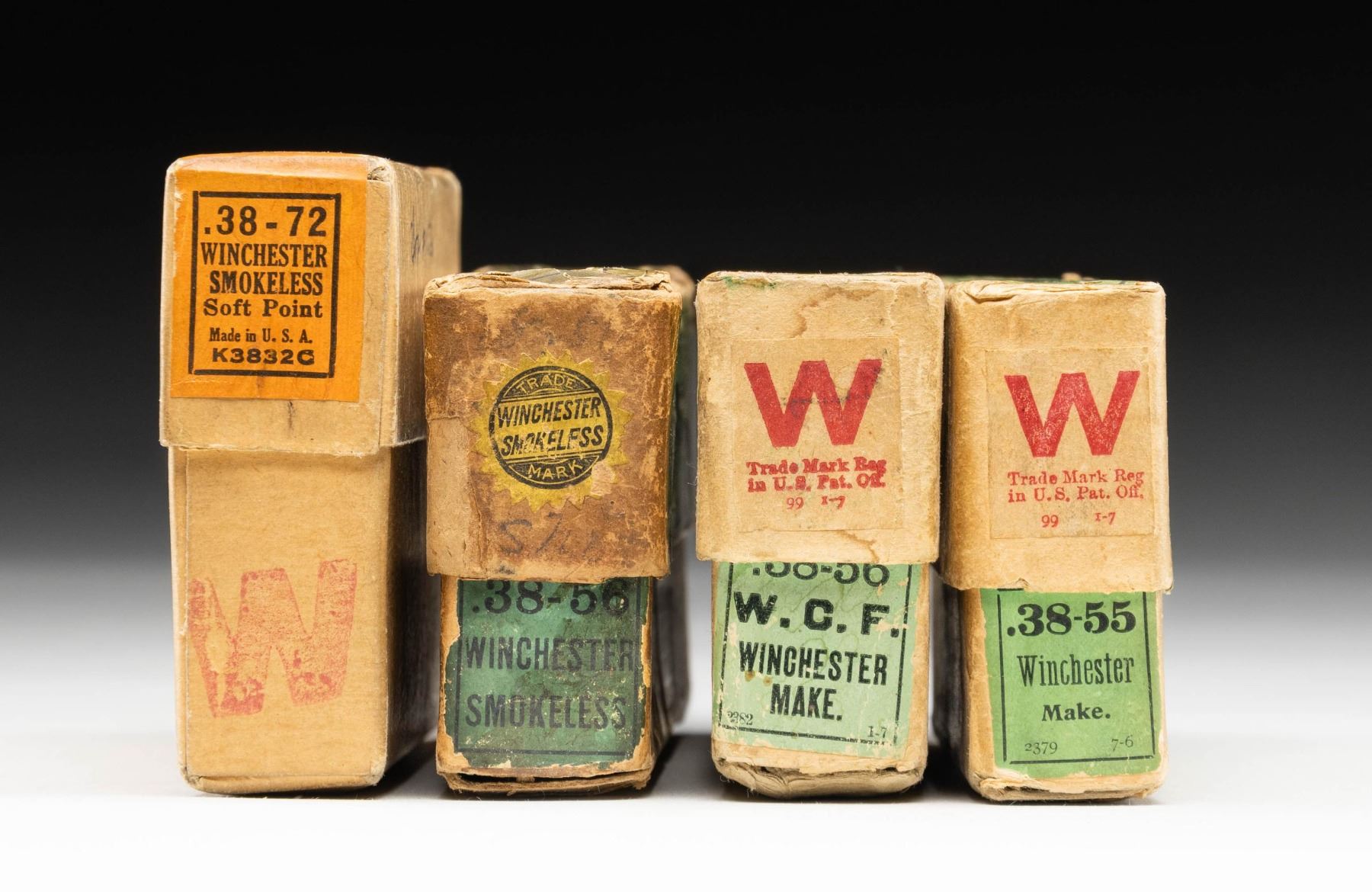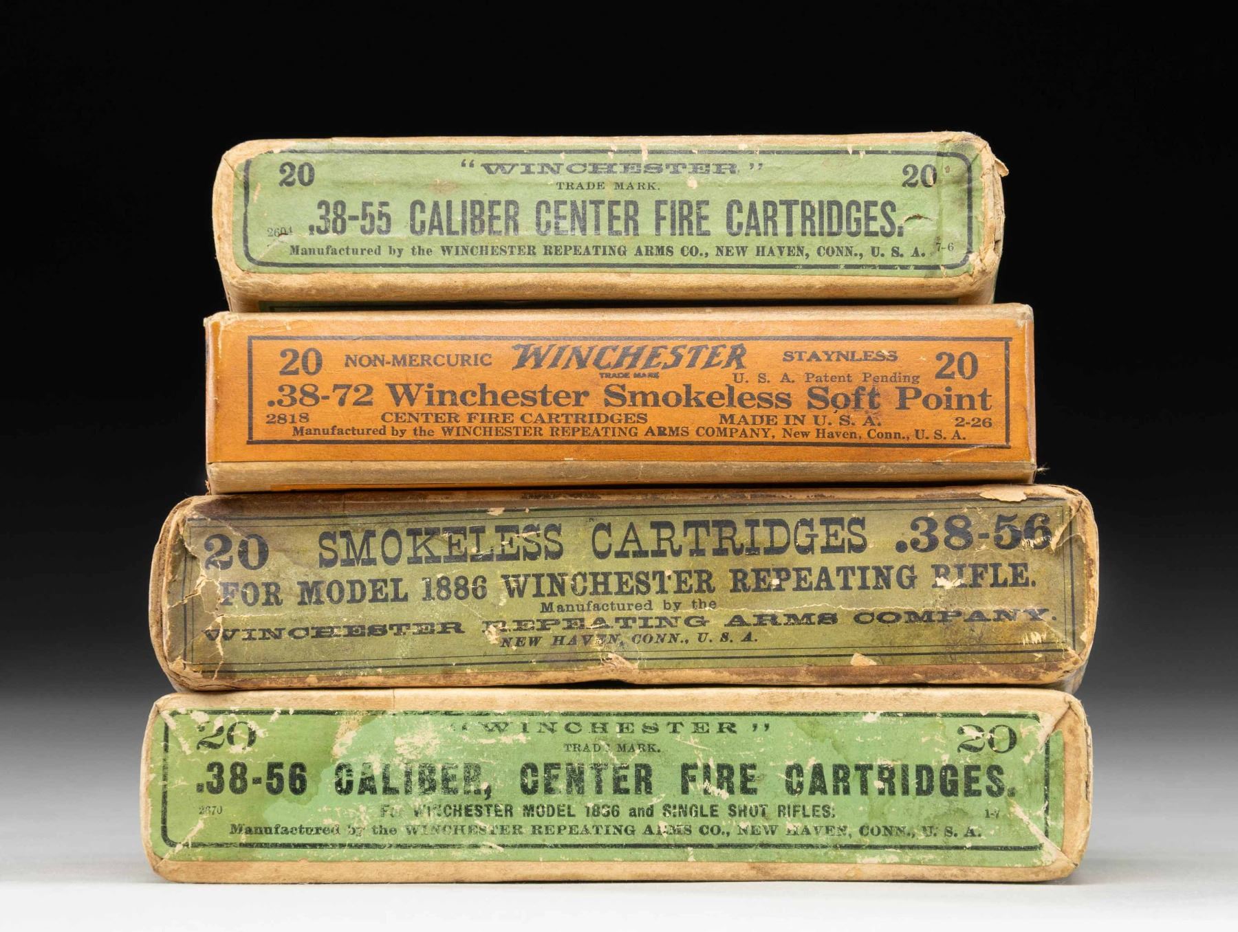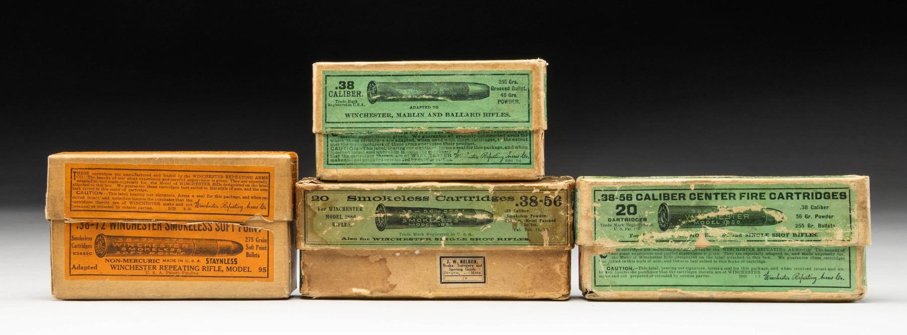 Very good 20 round 2 piece boxes with minimal scuffs; partials and mixed lots noted. 1). 38-56 Win. green labeled box with small retailer label from J. W. Nelson of Duluth, Minn. Water stains on box having 10 rds. of UMC with lead bullets (light powdery oxidation) plus 10 rds. WRA Co. marked having jacketed (silver colored) bullets and patina appearance. 2). 38-56 Win. with WRA Co. headstamps and jacketed (silver colored) bullets. Exceptional condition on 19, and 1 with very slight patina and mild flattening of lead tip. Very minimal spot of water staining on box. 3). 38-72 Win. in orange labeled box having cursive "Box # 136" on plain side of cover. Ammo and box are in remarkably nice condition. 4). 38-55 Win. in very nice green labeled box. 17 rds. are much later production with "W-W" headstamps and modern flat topped primers. 2 rds. have early domed primers and "WRA" headstamp. 1 rd. has early domed primer and "WRA Co." headstamp. PROVENANCE: The Esteemed Norm Greenberg Collection. (02-24841-2/NW). $350-500.
