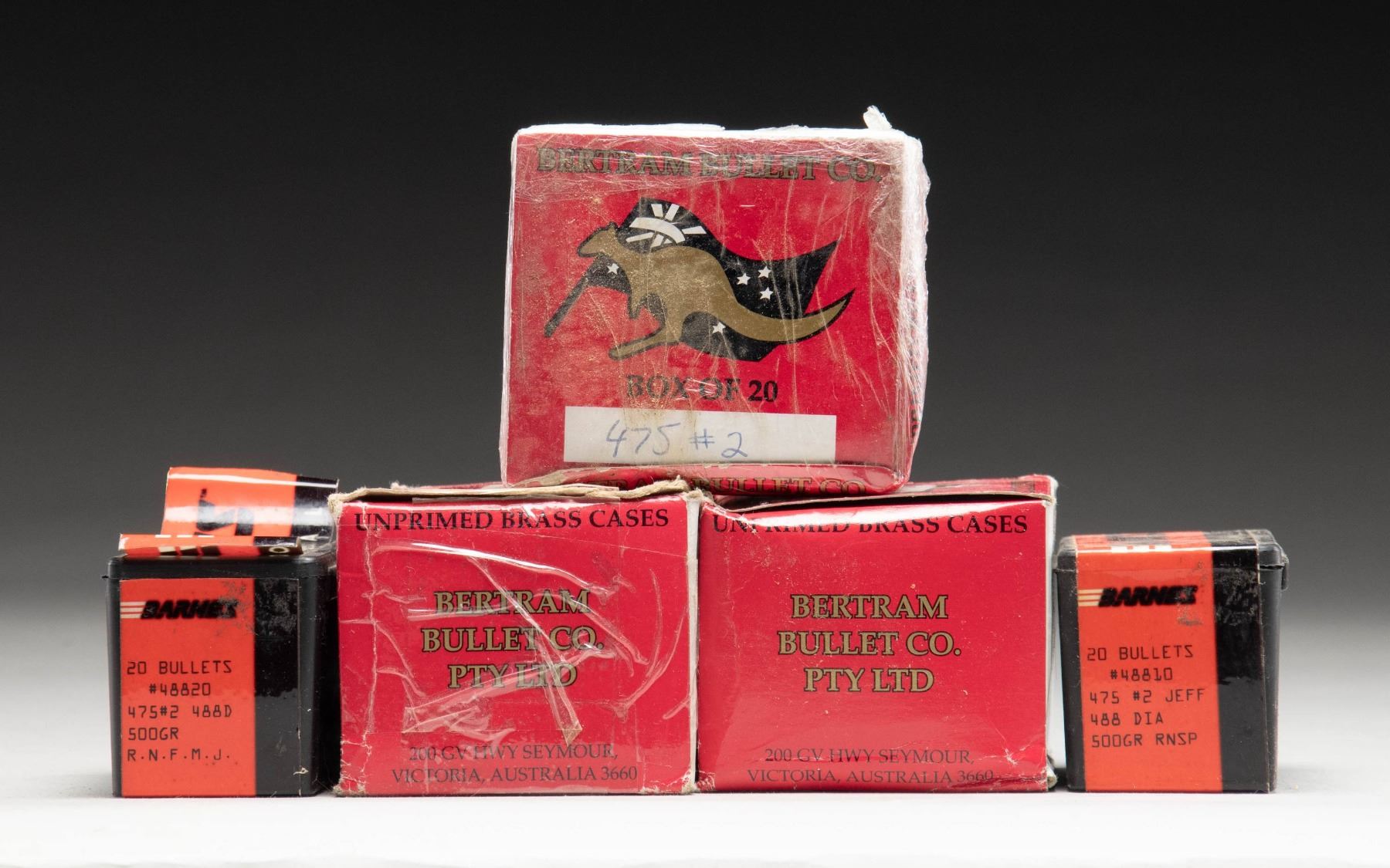 This lot consists of the following: 1) Two 20 rd. boxes of Barnes 475 bullets. 2) Three 20 rd. boxes of Bertram 475 bullets. CONDITION: ammo very good. Boxes show varying degrees of wear. (02-24225/MJC). $50-100 for lot.
