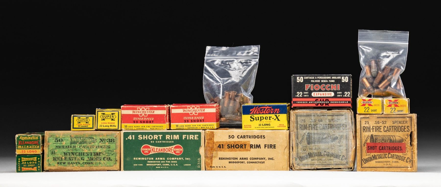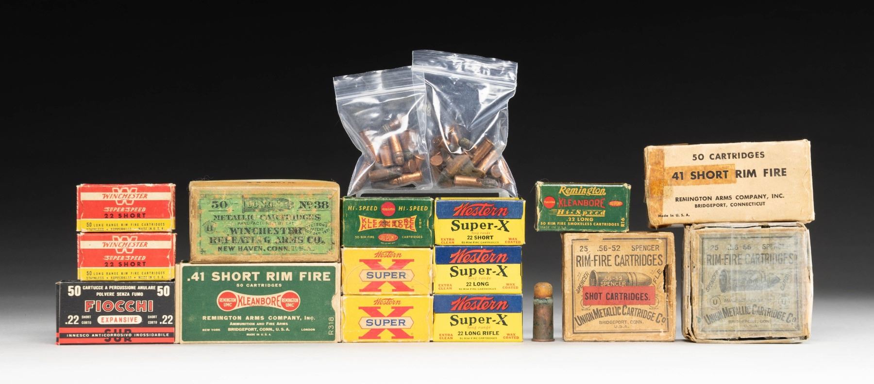 All in 50 round boxes unless noted. Partials and conditions are listed separately. 1). Near excellent Western Super-X 22LR with "Super-X" headstamps on nickel plated cases. 2). Near excellent Western Super-X 22 Long with "Super-X" headstamps on nickel plated cases. 3). Near excellent Western Super-X 22 Short with "Super-X" headstamps on nickel plated cases. 4). Near excellent Winchester 22 Short with "H" headstamps. 5). Very good box Western Super-X 22 Short with "Super-X" headstamps; near excellent ammo. 6). Fair to good box Western Super-X 22 Short with "Super-X" and "H" headstamps (50-50); near excellent ammo. 7). Very good Remington Kleanbore 22 Long box with over 30 miscellaneous 22 RF cartridges in very good condition. 8). Near excellent box of Fiocchi 22 Short Expansive ammo. 9). Very good empty Winchester Super Speed 22 Short box. 10). Good plus empty Remington Hi-Speed 22 Long box. 11). Good (tape repairs and end of top missing) box of Winchester 38 Long RF with green label on top of 2 piece box. Fair ammo having powdery oxidation on bullets and moderate patina on casings. 12). Near excellent Remington Kleanbore "Dog Bone" box of 41 Short RF. Copper cases and conical lead bullets. Cases have moderate spots of patina plus greased lead bullets in good condition. 13). Fair to good (tape repaired end and tray) plain Remington box (49 rds) of 41 Short RF ammo that is simply spectacular in condition! 14). Fair UMC .56-52 Spencer box for SHOT cartridges having applied red label stating "SHOT CARTRIDGES". One lone cartridge in fair to good condition with intact shot capsule. 15). Poor to maybe fair UMC .56-56 Spencer box with LOTS of tape repairs. A peek into the contents has poor looking ammo with notable powdery oxidation on bullets. 16). .32 Stevens Short RF ammo: 17 loose rounds with headstamps of "US" (1), "U" (3) and balance with diamond made by CIL of Canada. All about good plus with some light stains. 17). .32 Stevens Long RF ammo: 16 loose rounds with diamond headstamp by CIL of Canada; generally good condition. PROVENANCE: The Esteemed Norm Greenberg Collection. (02-24841-14/NW). AMMO. $400-600.