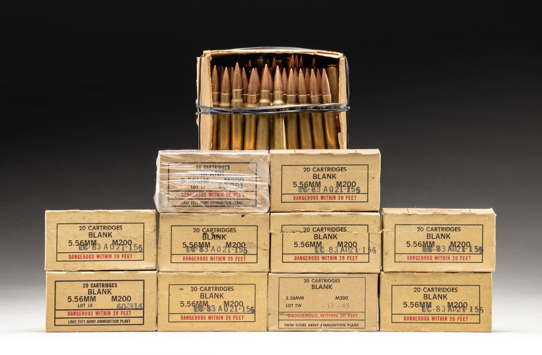This lot consists of an opened 90 rd. pack of 1945 dated Portuguese 8mm Mauser ammo that appears to be mostly full & ten 20 rd. boxes of USGI 5.56 blank ammo. CONDITION: ammo appears good or better with some light tarnishing. Boxes show varying degrees of wear. PROVENANCE: Norman Olliff Estate. (02-25678/MJC). $150-250 for lot.