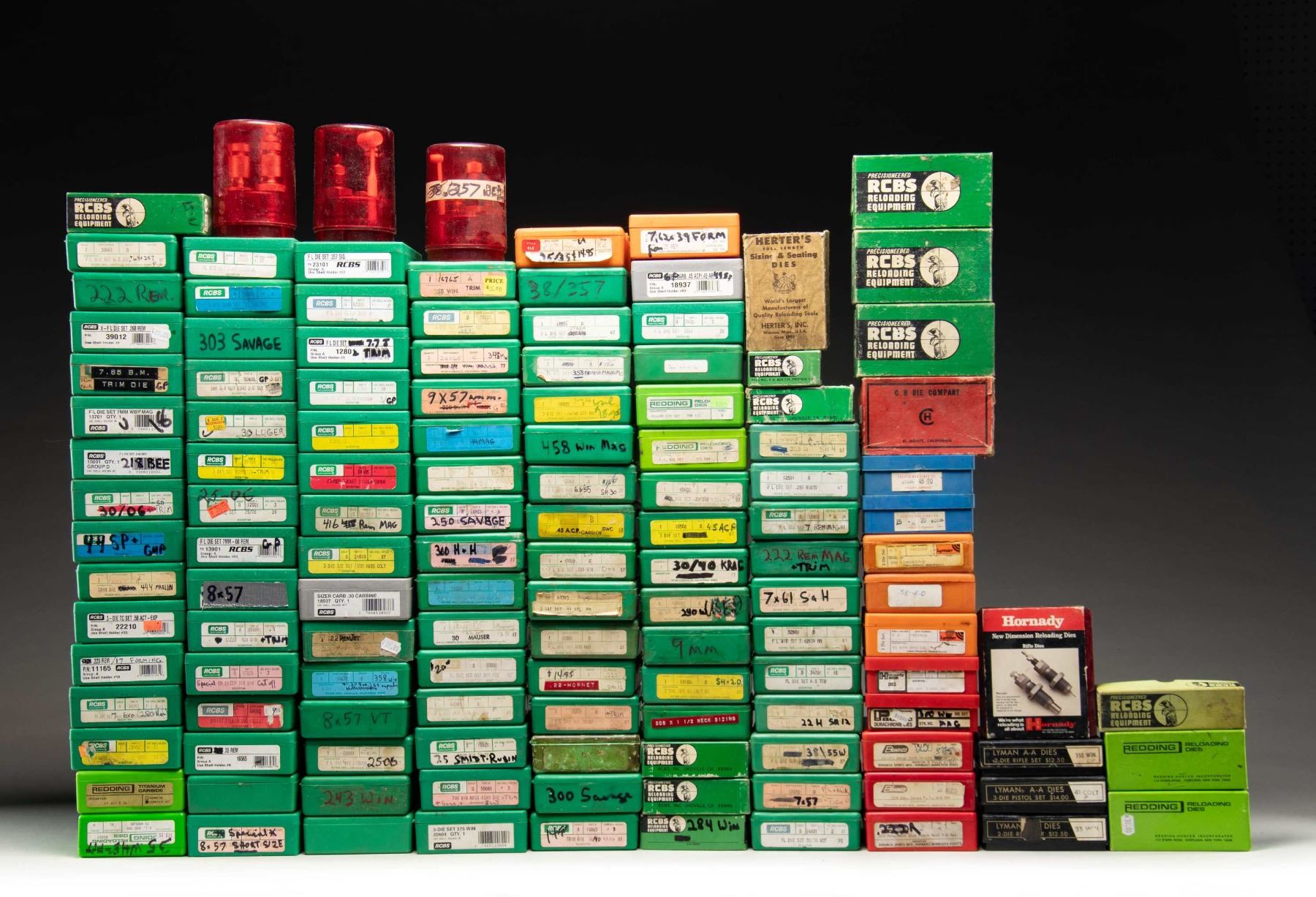 All in good useable (or better) condition with mostly original packaging. Some special purpose dies, but mostly general multi die sets predominately in plastic boxes. Listed by brand with most being RCBS. Some brands in boxes of another brand. Occasionally a box will have an extra duplicate or supportive die. RCBS: 9X57MM. / 260 Rem. including trim die. / 6.5X55MM. / 300 Savage. / 7MM Express. / 2 of 380 ACP. / 9MM Luger with extras and shell holder. / 50 Action Express. / 264 Win. Mag. / 38-357 Mag. Carbide. / 444 Marlin with trim die. / 44-40 Win. / 358 Norma Mag. / 458 Win. Mag. / 2 of 22 Hornet. / 7.65MM Belgian Mauser with trim die, shell holder, etc. / 6MM Rem. / 44 Spl. & Lyman Carbide 44 Mag. sizer. / 30-06 & trim die. / 10MM Auto. / 7.7 Jap & trim die. / 308 Win. Small Base sizer, trim die & Herter's neck sizer; no seater. / 308 X 1.5 neck sizer & seater. / 7.5 Swiss. / 45 Colt. / 9.3X74R. / 9.3X72R & trim die. / 9.3X72R. / .375 H&H Mag. / 25-06. / 7MM-08 Rem. / 240 Wby. Mag. / 45 ACP. / 45 ACP Carbide. /44 Spl. Carbide & shell holder. / 416 Rem. Mag. / 2 of 32 S&W Long. / 30-40 Krag. / 30 Mauser. / 358 Win. Trim die only. / Primer Pocket Swager combo. / 218 Bee. / 17-223 forming & trim dies. / 7MM Wby. Mag. / 222 Rem. Mag. & trim die. / 7MM Benchrest set; trim & forming dies plus extended shell holder & neck reamer die. / 223 Rem. with shell holder & trim die. / 257 Roberts. / 303 British including neck & trim dies. / 358 Win. / 6.5 TCU. / 22-250 with trim & neck dies. / 7.62X39MM & trim die. / 30 Luger. / 7X57MM with neck & trim dies. / 7MM Rem. Mag. / 30-06 plus Small Base & trim dies. / 30-30 with trim die. / 300 H&H Mag. with shell holder. / 44 Spl. sizer & expander plus 44 Mag. seater. / 2 of 222 Rem. FL sizer bodies only. / 38 Spl. with 2 sizers plus Lyman 38-357 sizer. / 357 Sig. / 357 Mag. plus carbide sizer. / 7.62 Russian. / 7X64MM. / 7-30 Waters. / 6.5 Jap plus Pacific 6.5X257 sizer. / 35 Remington. / 32-20 Win. / 6MM-284. / Press priming adapter (Large). / 6.5 Carcano sizing die only. / 30 Carbine carbide sizer with Redding seater & crimper. / 308 Win. plus trim die. / 2 of 8X57MM (8MM Mauser); missing 1 decapping stem. / 375 Win. / 44 Spl. & Mag. plus carbide sizer. / 250 Savage. / 38 ACP carbide sizer only. / 8MM Rem. Mag. / 25-06 plus trim die. / 22 Rem. Jet. / 35 Rem. plus trim die. / 2 Bullet Pullers with 4 collets (2 of 30 cal, 6.5MM and 8MM). CH: 303 Savage. / 30-40 Krag. / 257 Wby. Mag. / 375 Wby. Mag. / 8MM Mauser. / HERTER'S: 348 Win. / 30-06. / PACIFIC: 25-20 Win. & Lyman tong tool parts. / 300 Win. Mag. / 25 ACP. / 45-70. / LYMAN: 7X61 S&H. / 38-55. / 38-40. / 308 Win. plus micrometer seater. / 32 Win. Spl. / 270 Win. / 7.62X39 forming dies (2) plus shell holder. / 25-35 Win. plus PA seater. / 308 Win. plus RCBS trim die & neck reamer die (no reamer). / 284 Win. / 8MM Lebel. / 41 Long Colt plus RCBS shell holder. / 358 Win. / 35 Win. / BONANZA: 222 Rem. Neck with Benchrest seater plus RCBS FL & seater dies. / 338 Win. Mag. / 22-250 Benchrest seater & RCBS trim die. / REDDING: 375 H&H Mag. / 7MM TCU with extra neck die. / 30-30 trim die. / 9MM Luger taper crimp die. / 45 ACP carbide with RCBS shell holder. / 35 Whelen. / LEE: 7MM-08. / 38 Auto J6 carbide sizer, 38 S&WL I6 seater, 38 S&W G6 powder die plus shell holder and powder scoop. / HOLLYWOOD: 8X56MM Man. Sch. / HORNADY: 7MM-08. / FORSTER-APPELT: Bullet puller with .357 collet. plus Lac-Cum .224 puller. / MIXED: 3 of 30-06 sizers; RCBS FL, RCBS Small Base plus CH. / Lyman carbide 45 ACP sizer, CH 223 Rem. taper crimp die plus Pacific 41 Rem. Mag. carbide sizer. / RCBS 243 Win. sizer, RCBS 308 Win. sizer, RCBS 444 Marlin sizer, RCBS 219 Donaldson Wasp trim die plus short unmarked die. (02-25369/NW). $1,000-1,500.