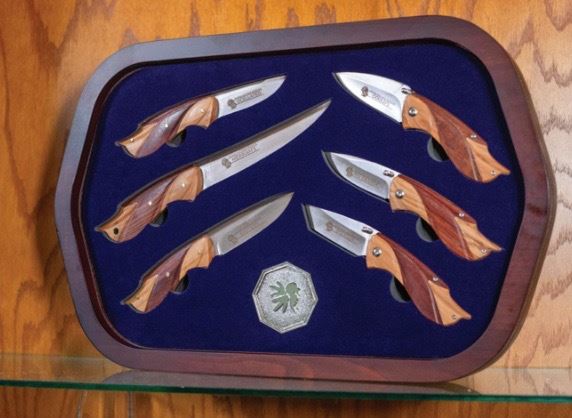 This two-tone knife set features blade artwork of each wild turkey subspecies and the Ocellated turkey species on red sandalwood and olive handles. This six-piece set includes three fixed blades (Ocellated, Merriamís and Eastern) and three folding knives (Gouldís, Rio Grande and Osceola). They come in a tempered glass-top display case complemented by the NWTF emblem on a silver medallion. This item was generously donated by National Wild Turkey Federation.