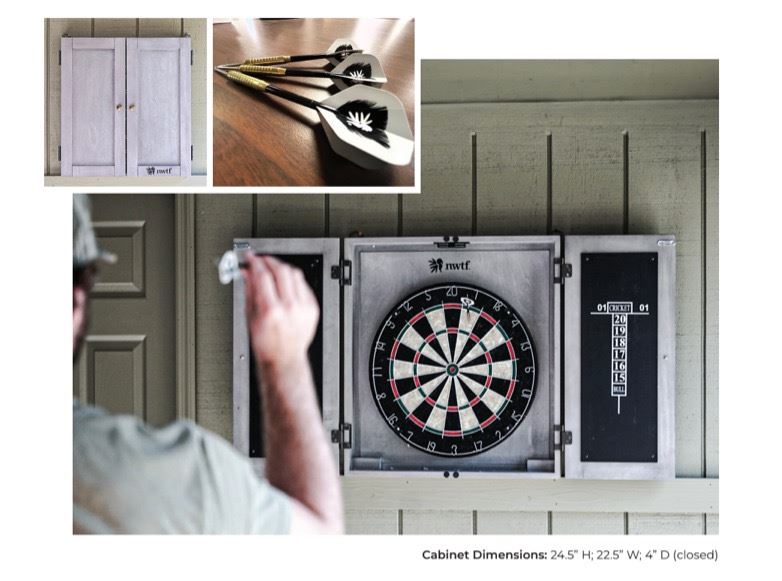 Home in on the bullís-eye and compete at camp or home with this custom NWTF dart board cabinet that replicates an old barn wood look. The bristle dartboard with wire dividers features the NWTF logo on the doors, inside the cabinet and on the darts. This item was generously donated by National Wild Turkey Federation.