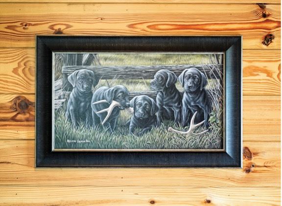 This fabulous canvas print will warm the hearts of all hunters and lab enthusiasts. Melissa Ball's depiction of future shed trackers showcases a litter of young black labs already training for a life in the outdoors. This item was generously donated by National Wild Turkey Federation.