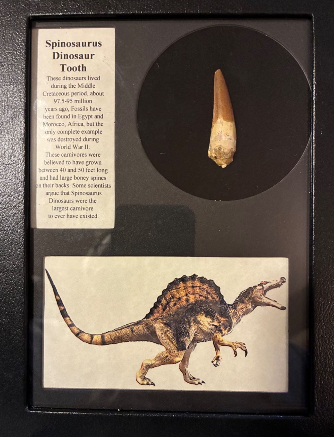 A genuine Spinosaurus dinosaur tooth, one of the most sought-after fossils from the largest carnivorous dinosaur ever to walk the Earth. Dating back over 95 million years, this stunning natural artifact is a conversation-starting centerpiece for any collector or nature lover. This item was generously donated by Smoky Mountain Knife Works.
