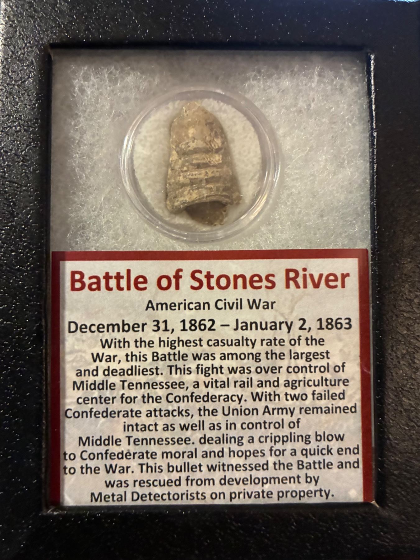 An authentic fired bullet recovered from the Battle of Stones River, a pivotal December 1862 Union victory in Tennessee. This original Civil War relic is a powerful reminder of the soldiers who fought on that hallowed ground. This item was generously donated by Smoky Mountain Knife Works.