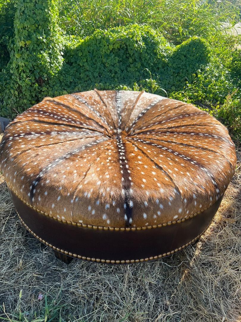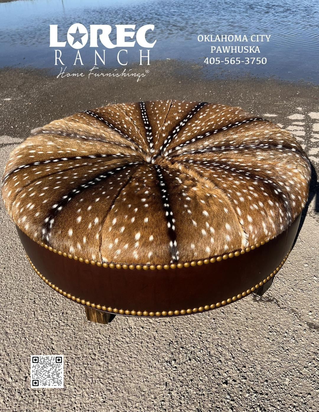 Handcrafted by LOREC Ranch Home Furnishings, this stunning 28-inch round ottoman showcases the natural beauty of premium axis deer hide. Each piece is truly one-of-a-kind, highlighting the rich tones and distinctive spotted pattern that make axis hide so sought after.