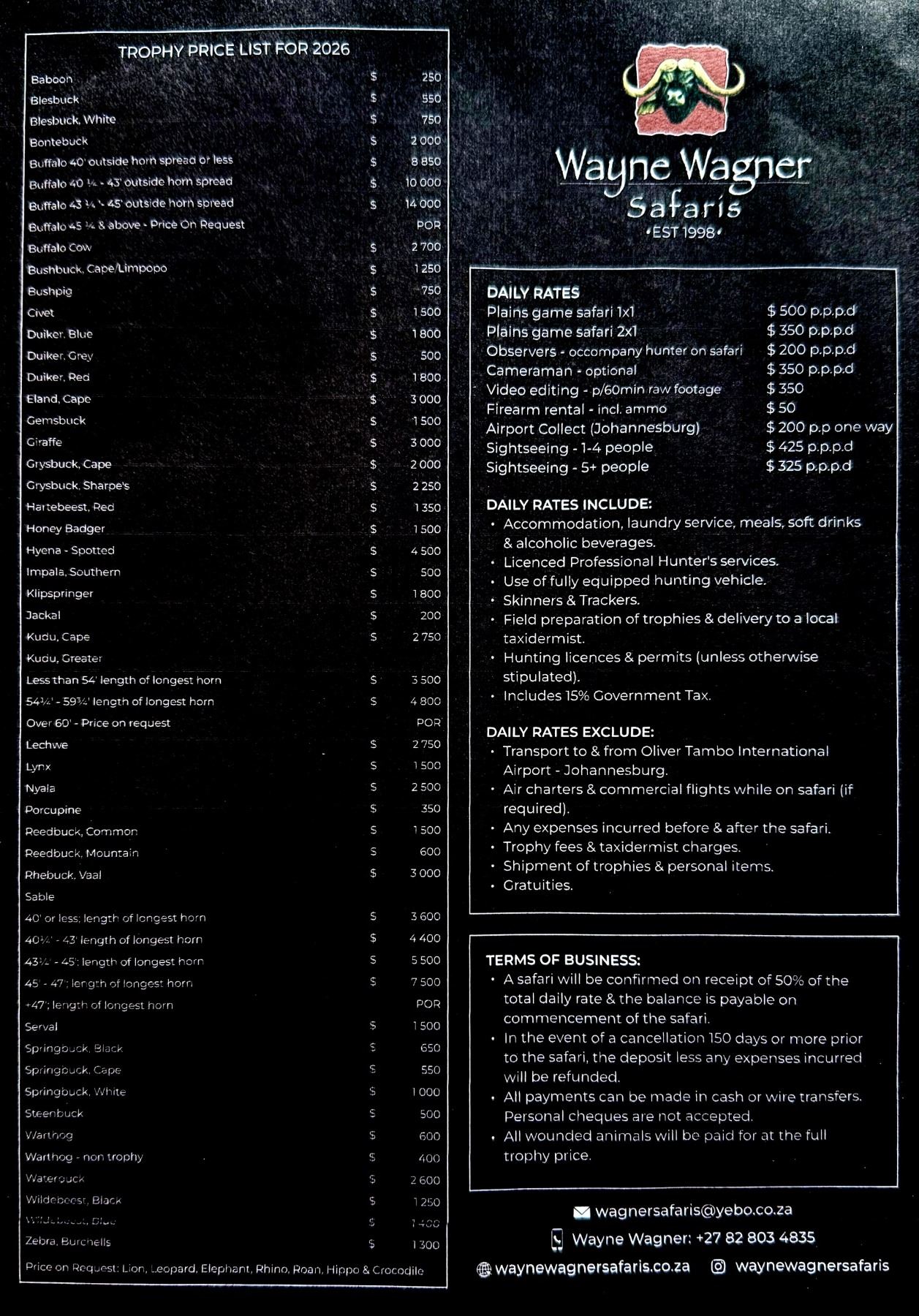 The daily activities will be much more varied than a typical photo safari, and can also be tailored to the guests’ own preferences. Some of the planned activities will include morning and late afternoon game drives along the banks of the Olifants River, when the wildlife is the most active. Bushwalks will be added for the more adventurous guests. A day trip to the renowned Kruger National Park would certainly be recommended, as well as a trip to the Blyde River Canyon, the third largest canyon on the planet. Visits to the Moholoholo Wildlife Rehabilitation Center, the Tzaneen Lion & Predator Park and the Khamai Reptile Conservation Park can provide guests some up-close time with rare, vulnerable and endangered species. There will also be time for some local shopping and sightseeing if desired, or a tour along the famous Panorama Route to see multiple waterfalls, God’s Window, the Three Rondavels, and Bourke’s Luck Potholes. For those who are interested, hunting days can be arranged for one or both guests. The home base for Wayne Wagner Safaris is “Excellence”, a large, appropriately named property nestled at the foot of the Drakensburg mountains along the banks of the Olifants River where a great variety of plains game and dangerous game can be found. After some game drives it wouldn’t be surprising if the hunt option is requested! Hunting option will be at current published rates. This trip can be taken between May and December in 2026 or 2027.