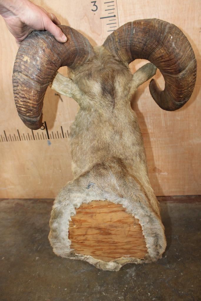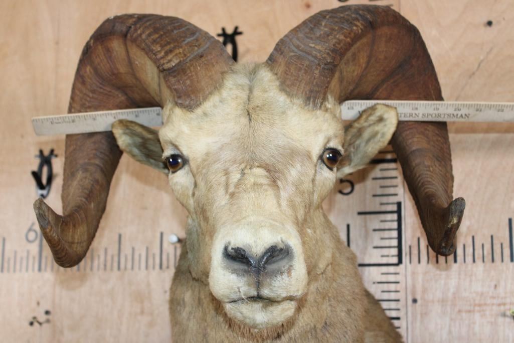 Massive XXL ROCKY MOUNTAIN BIG HORN Sheep Ram Shoulder Mount with Heavy Horns. The Left Horn measures 32 1/8" Long and 14.25" around the Horn Base. The Right Horn measures 32.75" Long and 14 1/8" around the Horn Base. This is a Nice mount in Good Condition. TAXIDERMY