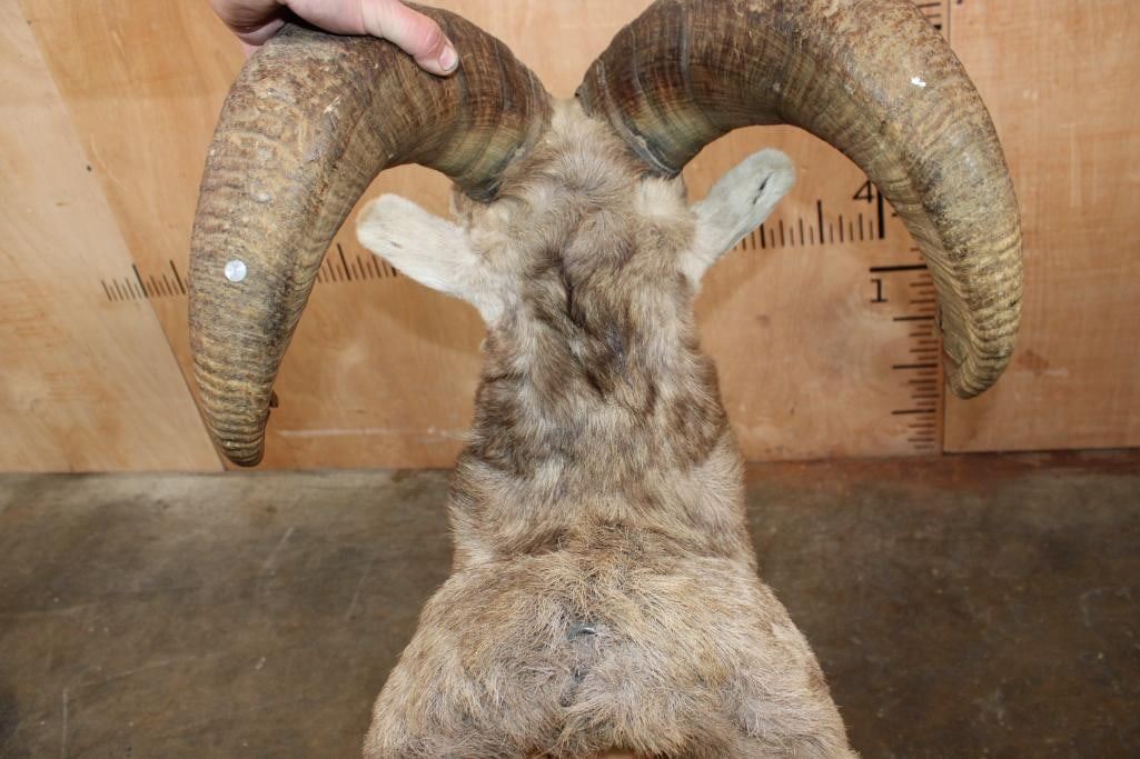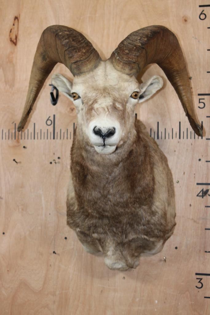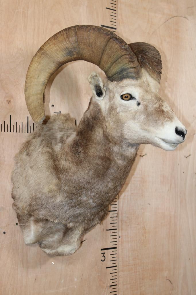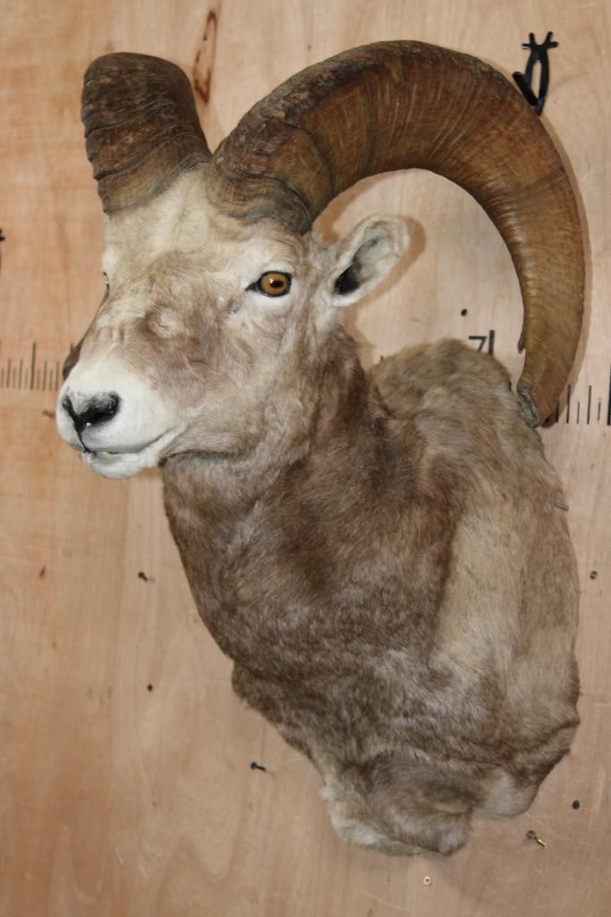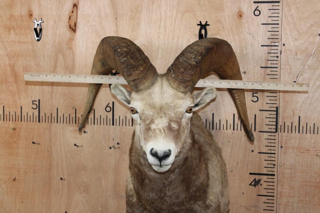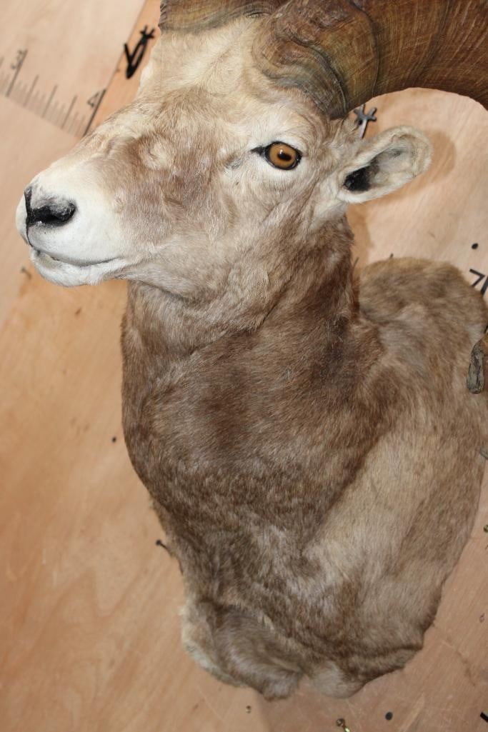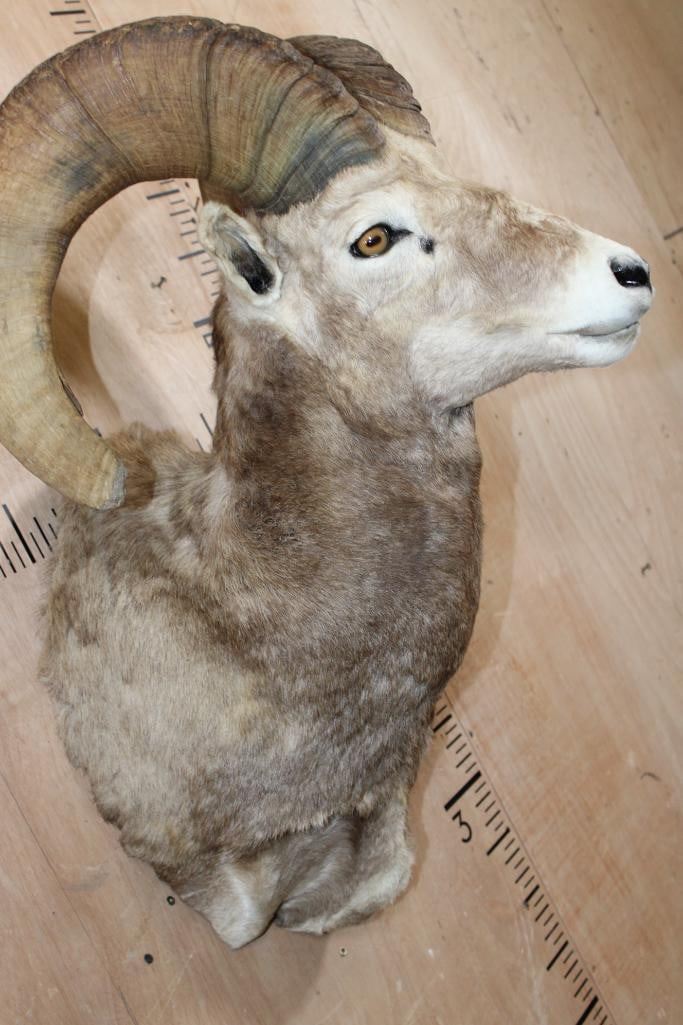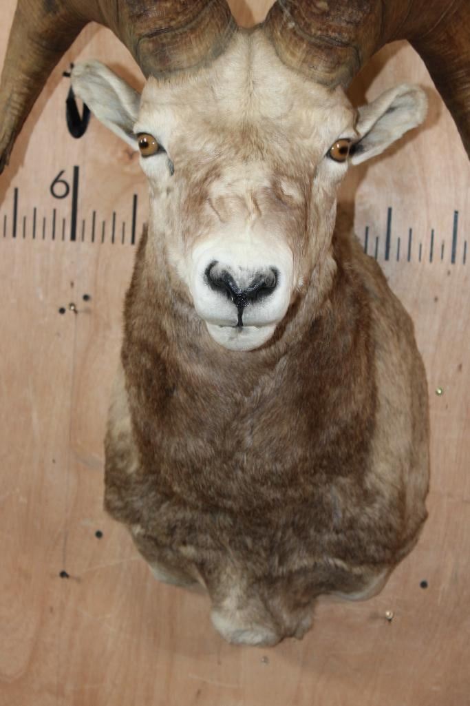 XXL Massive SNOW SHEEP Shoulder Mount. The Left Horn measures 31 3/8" Long and 14" around the Horn Base. The Right Horn measures 29 7/8" Long and 14 1/8" around the Horn Base. This is a Nice and Clean mount in Good Condition. TAXIDERMY