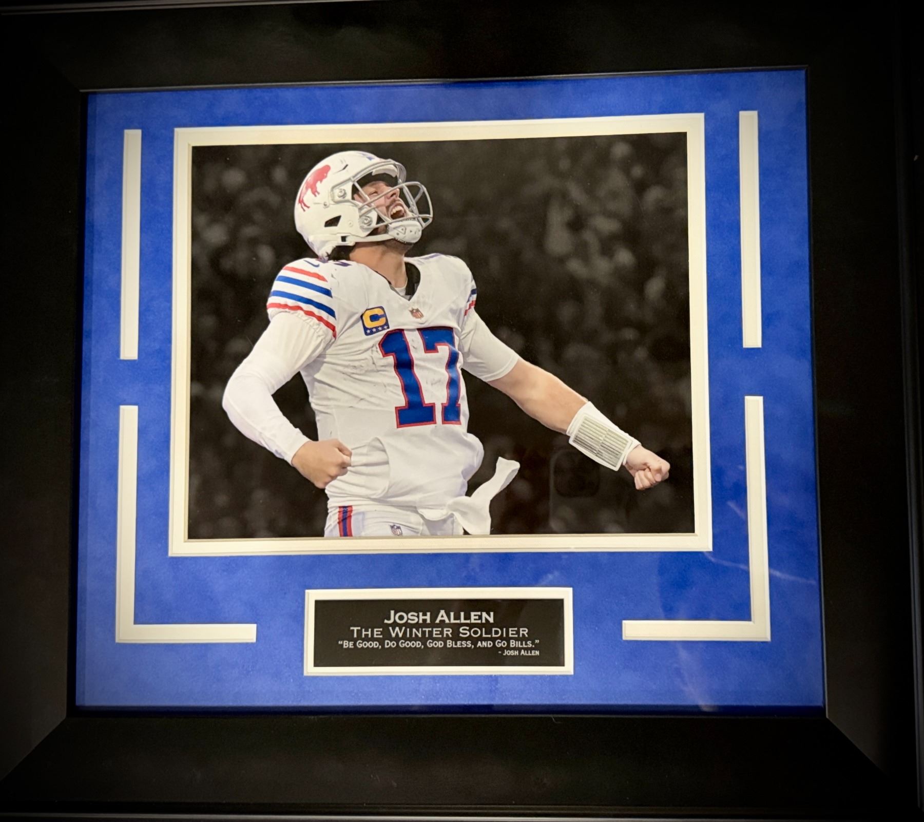 A great framed photo of Josh Allen. His quote; "Be Good, Do Good, God Bless, and Go Bills"