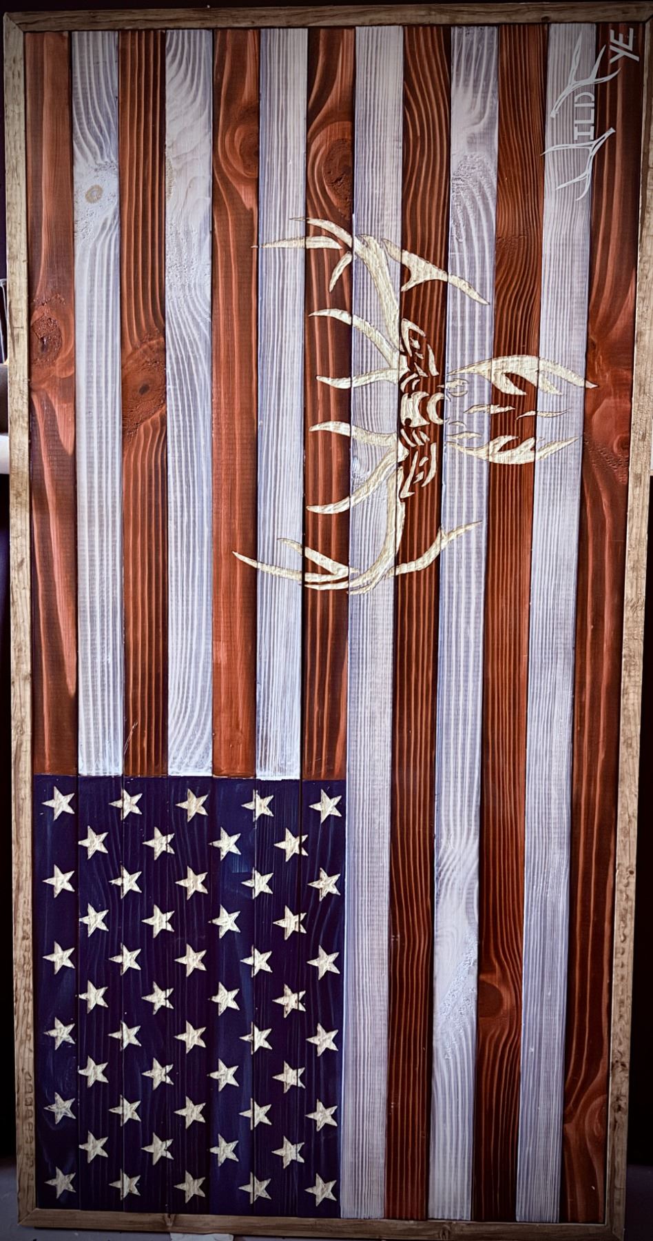 Custom-made piece of art by Wyld Eye. This is a 45"x23" wood piece of the US flag with an elk engraving.