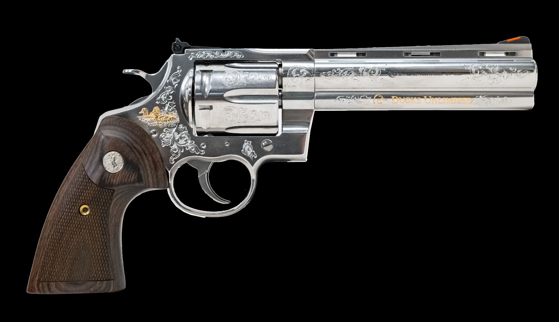 This stainless-steel revolver is chambered in .44 Magnum with a 6” barrel, combining power and precision. Custom wood grips provide a refined touch, while exclusive engraving and gold inlay enhance its collectible appeal. Featuring Ducks Unlimited embellishments and DU serial numbers, this revolver is a standout piece for collectors and enthusiasts alike.