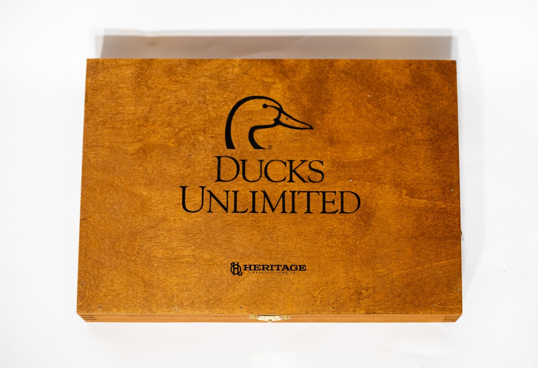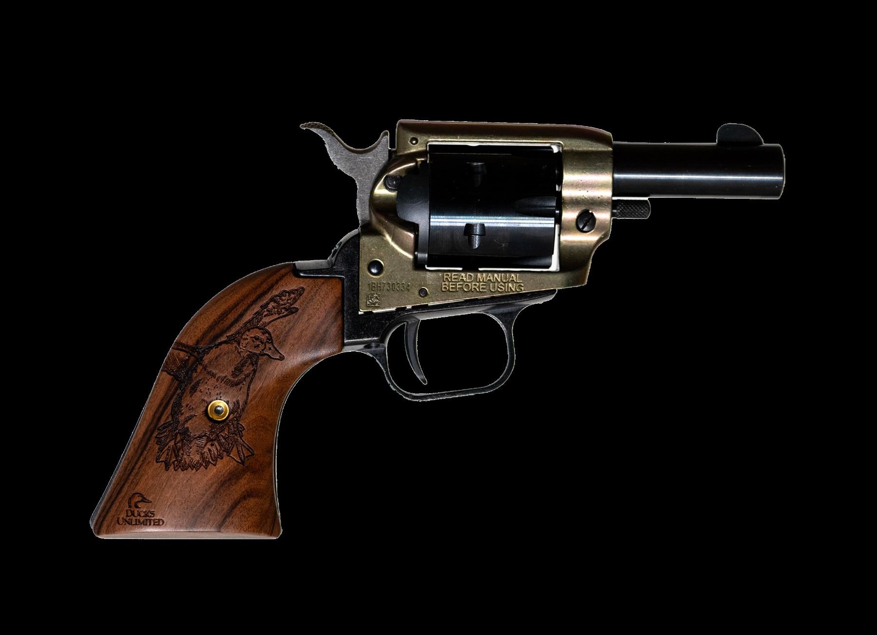 The Heritage Barkeep Kit is a charming and compact .22LR revolver. With a 6-round capacity and a 2.68-inch barrel, this revolver is designed for both functionality and ease of use. The simulated case-hardened finish gives it a classic, rugged look, while the engraved grips featuring the DU logo add a touch of elegance. The kit also includes a flask and two shot glasses, both adorned with the DU logo, making it a unique and complete package. For secure storage, a gun lock is included. The Heritage Barkeep Kit blends traditional design with practical features, making it a delightful addition to any firearm collection.