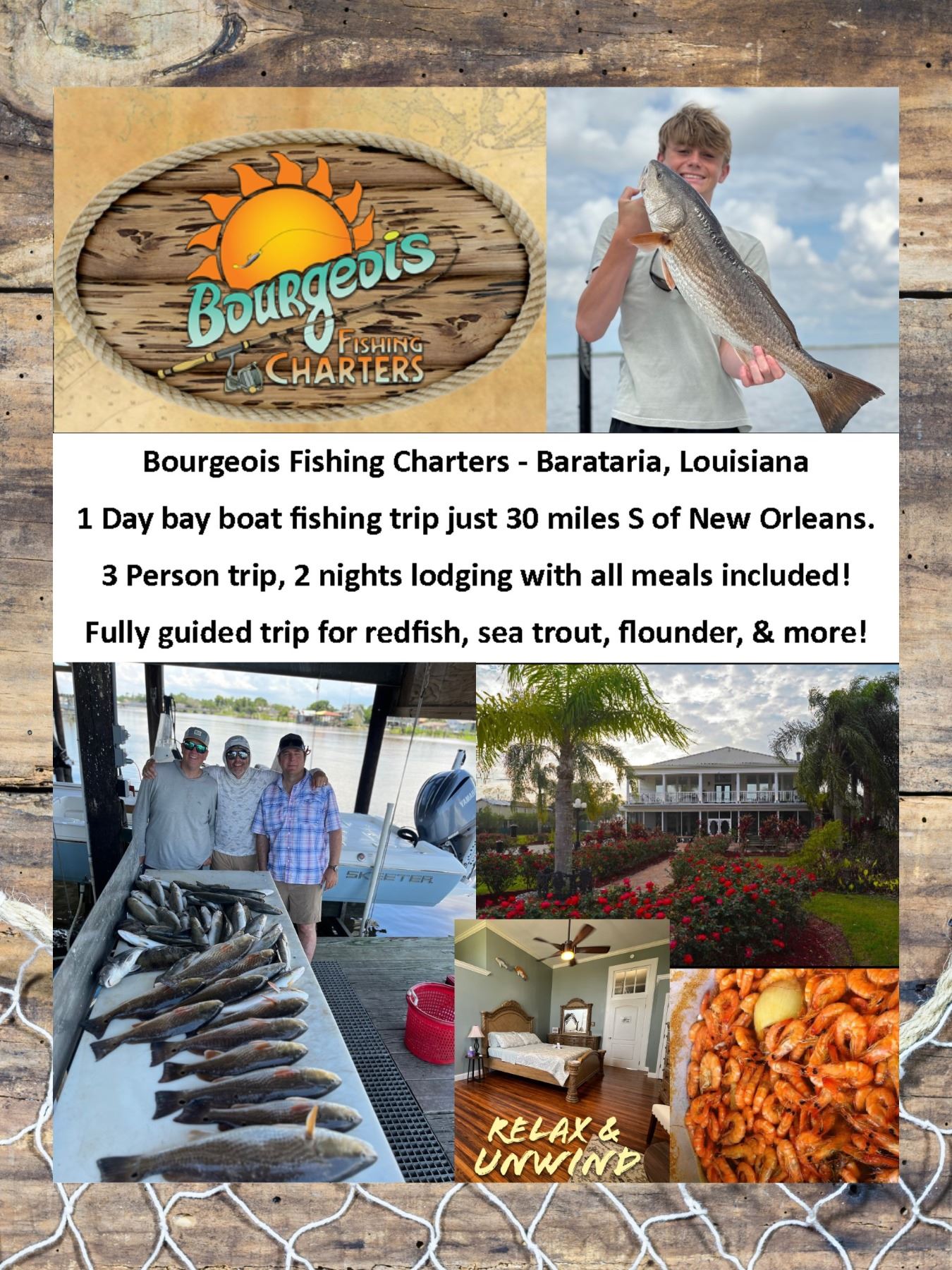 Head to Barataria, Louisiana for a 1 day bay boat fishing trip just 30 miles South of New Orleans. Includes fishing for 3 people, 2 nights lodging with all meals. Includes fish cleaning, guides, and all equipment.