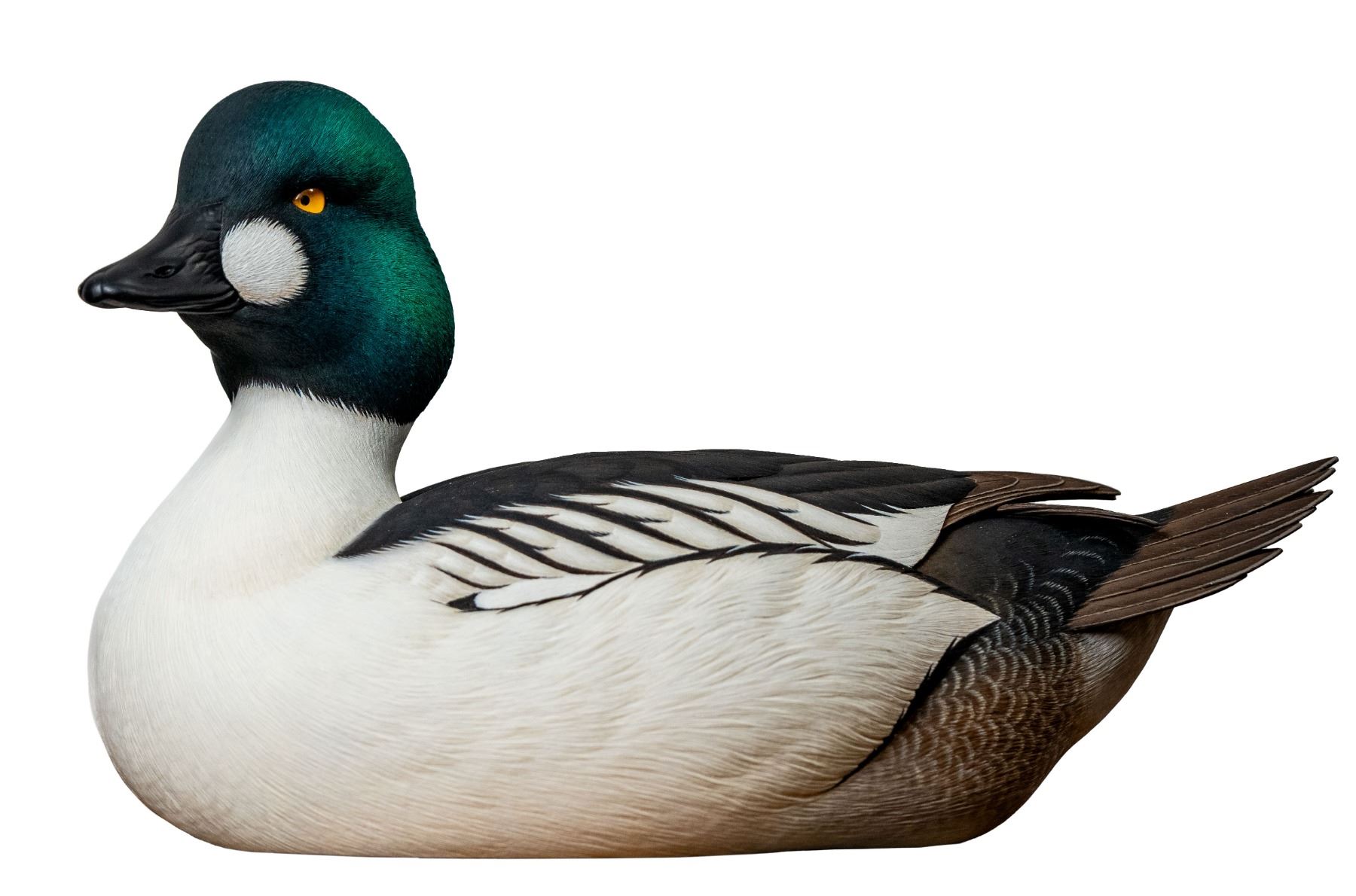 Beautifully detailed and expertly crafted, the Goldeneye Decoy is a cast resin piece by five-time World Champion carver Jett Brunet. Measuring 14.5” x 7” x 6”, this exceptional work reflects the precision and artistry that have made Jett a cornerstone of the Ducks Unlimited national package, where he has been featured thirty-seven times since his debut in 2000. A Ducks Unlimited brass medallion is inlaid into the felt-covered bottom, ensuring authenticity and collectible value. This goldeneye decoy serves as both a tribute to master craftsmanship and a prized addition to any collection.