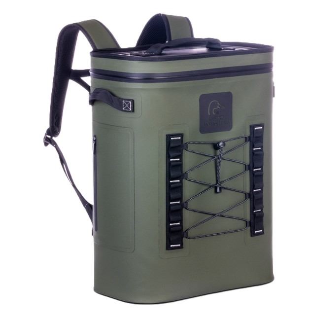 Olive-green backpack cooler with black accents combines practicality and style, prominently displaying the Ducks Unlimited logo on the front. Designed for convenience, it includes padded, adjustable shoulder straps, side and top handles, multiple exterior pockets, a bungee strap, and a built-in bottle opener. The waterproof, airtight zipper and 1-inch dense foam padding provide excellent insulation, keeping contents cold and secure wherever your adventures take you.