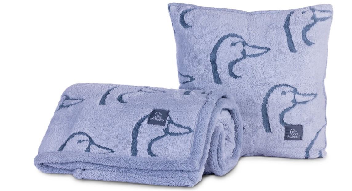This duckhead throw and pillow set combines comfort with distinctive style, featuring a gray embossed duckhead logo in a repeating pattern. Both pieces include a woven label showcasing the Ducks Unlimited logo for added detail. The cozy throw measures 50” x 60”, while the matching pillow is 18” x 18”, making this set a perfect accent for any living space.