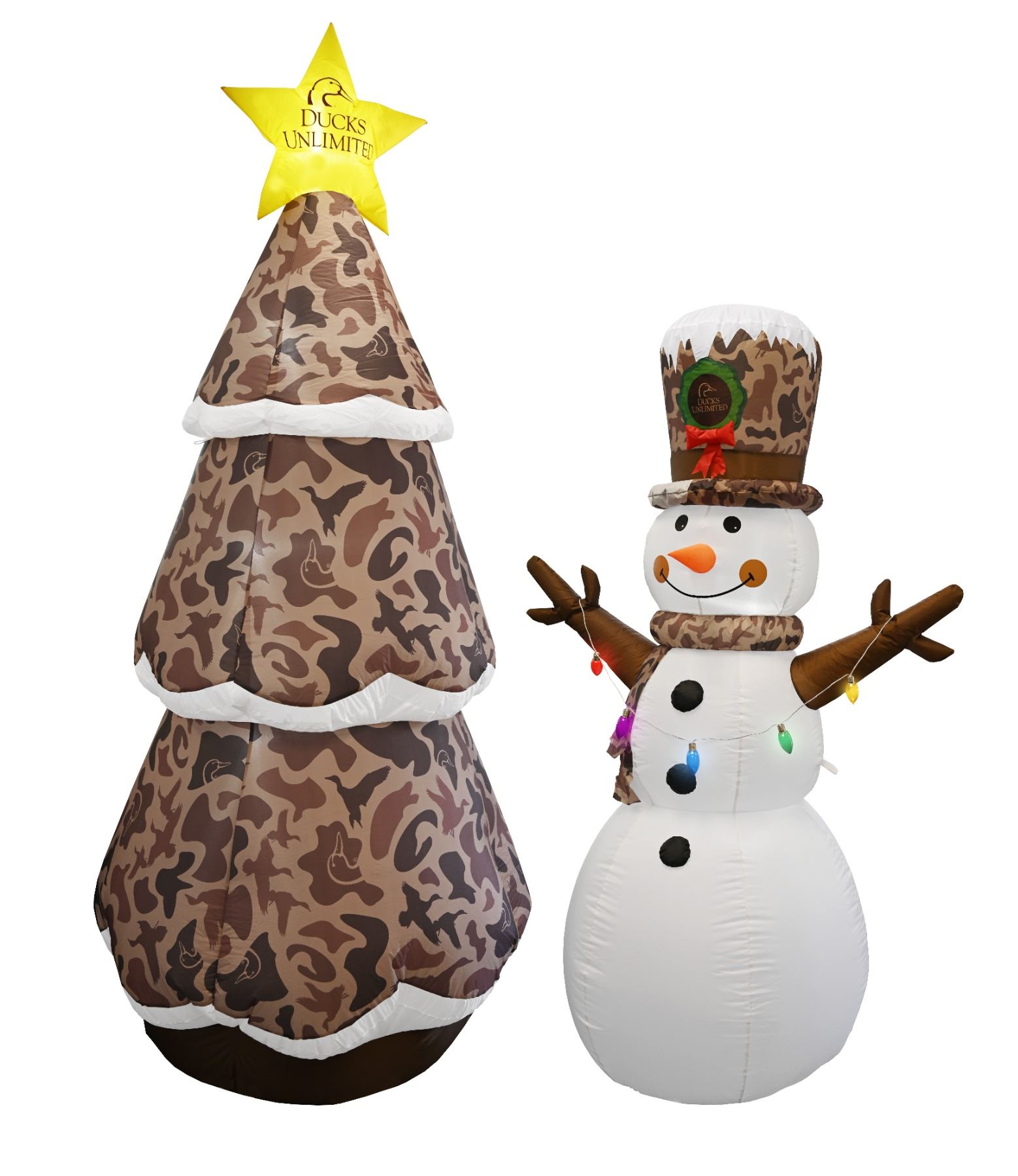 Adorn your lawn with the DU Camo Inflatables set, featuring an 8’ tree and a 6’ snowman for a festive, outdoorsy display. The tree showcases the classic DU camo pattern with the logo on the star, while the snowman wears a camo hat and scarf, also featuring the DU logo. Crafted from durable 190T polyester with a PU coating, both inflatables are weather-resistant and built to last. The set includes a DC12V blower, UL/ETL adaptor, stakes, and ropes for quick and easy setup, bringing a playful, camouflage-inspired touch to any outdoor space.