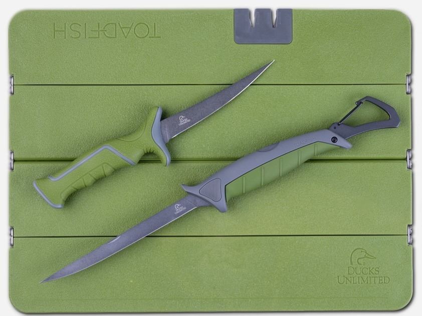 The Fin & Feather Gift Set combines functionality and style, featuring a 5in fixed blade fillet knife and a 7” stowaway folding fillet knife for versatile use. A stowaway folding cutting board, measuring 12” x 16” when unfolded, provides ample workspace and includes a neoprene carrying case with a built-in knife sharpener. Each item proudly displays the Ducks Unlimited logo, and the entire set is packaged in a custom co-branded box featuring both Ducks Unlimited and Toadfish logos, making it an ideal gift for outdoor and culinary enthusiasts.