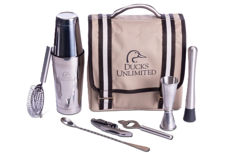 This portable mixology bartender kit is ideal for crafting cocktails anywhere, whether at backyard gatherings or on adventures at the duck camp. The set includes a 2-piece shaker, shot jigger, muddler, mixing spoons, strainer, and wine bottle opener, all neatly organized in a durable nylon carrying case. Both the case and shaker feature Ducks Unlimited logos, combining functionality with distinctive style for the ultimate on-the-go bar experience.