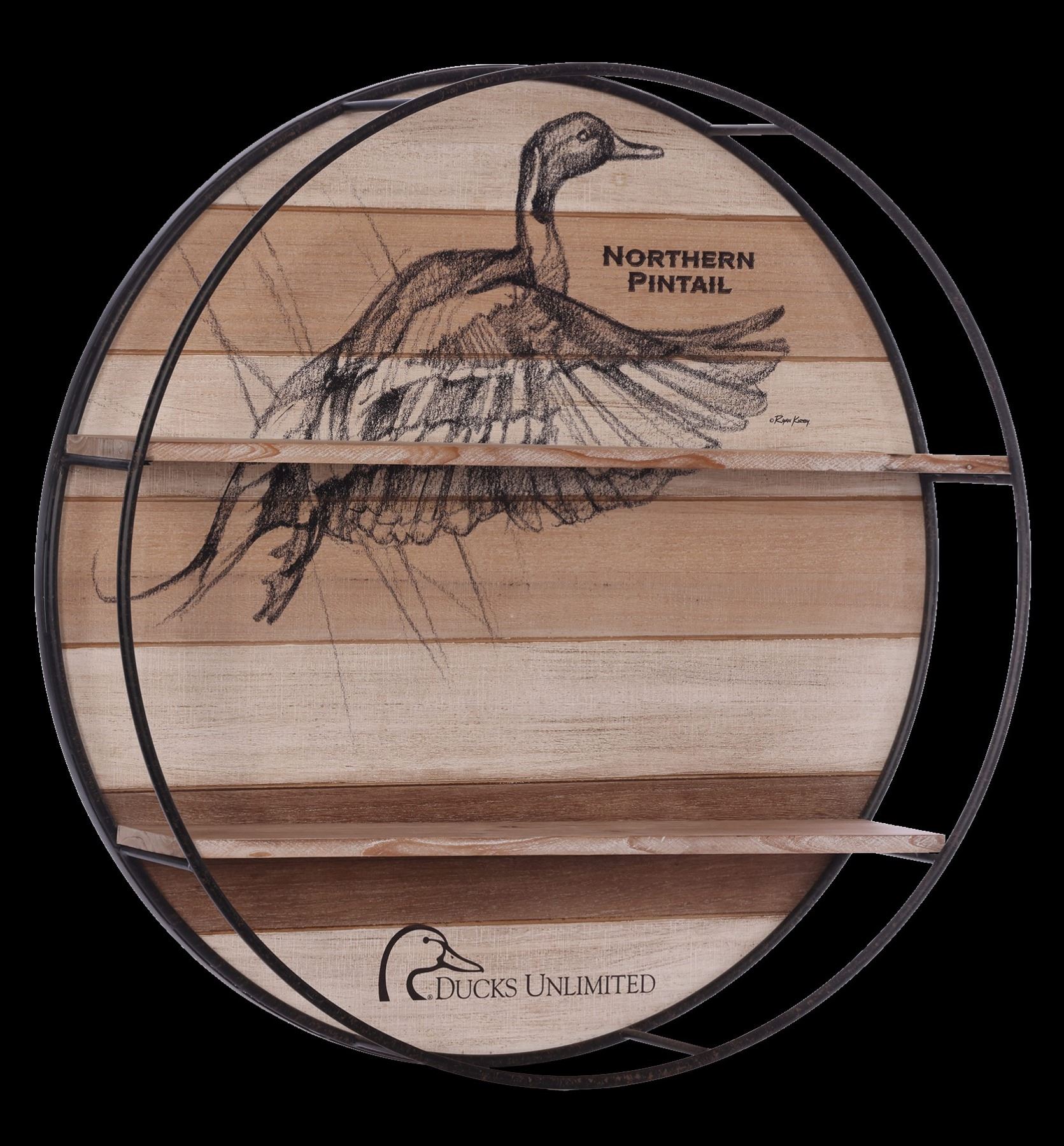 This unique wall shelf offers a stylish addition to any home décor, seamlessly combining metal and wood elements. Showcasing artwork by Ryan Kirby, this shelf features a beautiful mix of whitewash and natural wood for the background, adding a touch of rustic elegance. The horizontal Ducks Unlimited logo at the bottom of the shelf adds a distinctive brand touch. Perfect for displaying your favorite items, this wall shelf not only offers practical storage but also enhances the aesthetic appeal of any room.