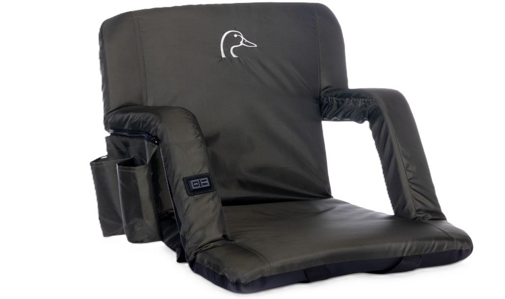 This set of two heated stadium seats delivers comfort and durability with a deep olive-green waterproof fabric finished with a PVC coating. Each seat is accented with a white embroidered duckhead logo on the back, combining function with Ducks Unlimited style. Designed with adjustable positions, a side zippered pocket, and a slip-resistant bottom, these seats offer convenience whether at the stadium or in the field. Adjustable backpack straps and anchor straps make transport and setup simple, while the heating element is compatible with a power bank (not included) to provide warmth on cold days. Measuring 21” x 17” with arms down and 15” x 17” with arms up, the seats are built for versatility and comfort.