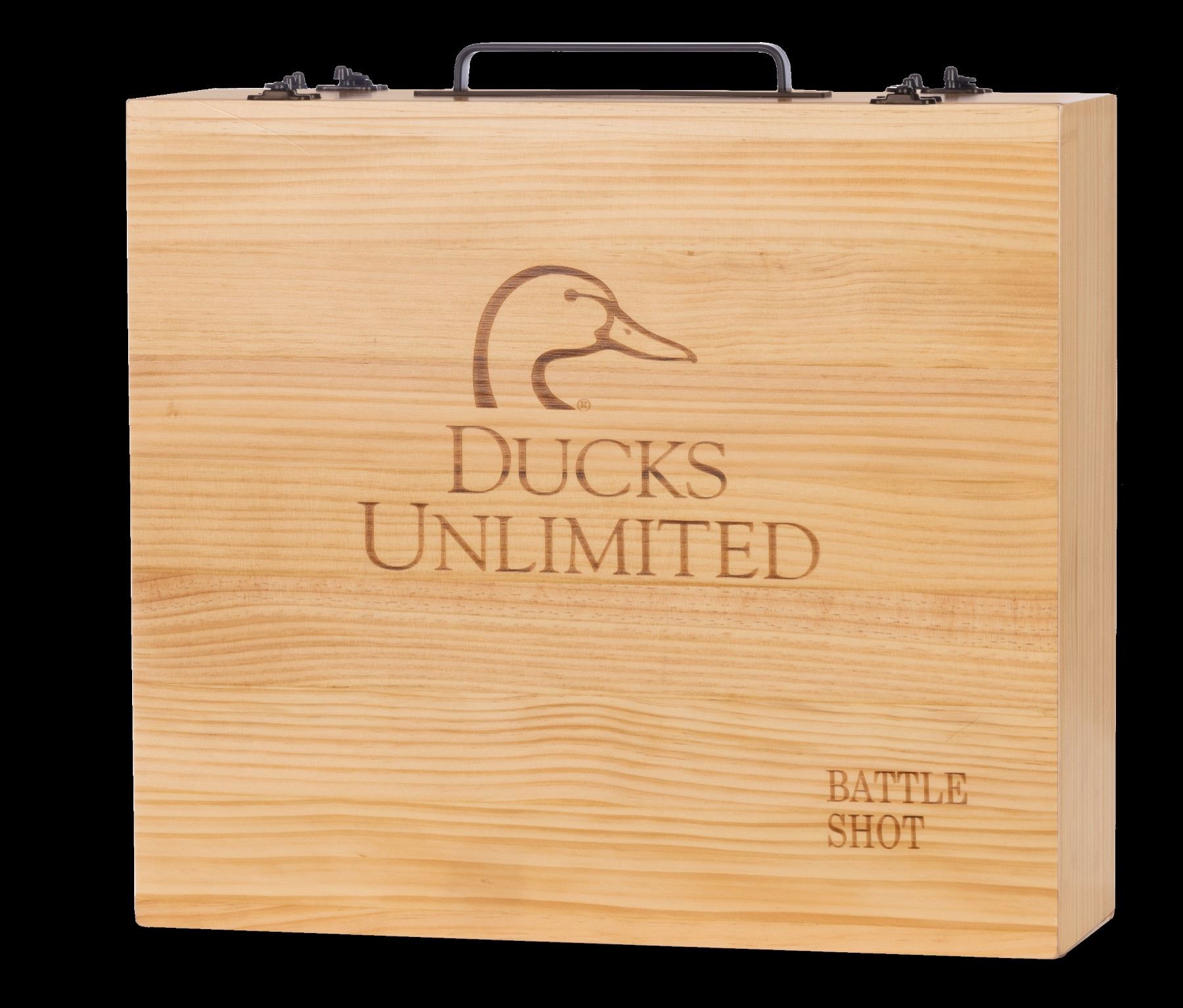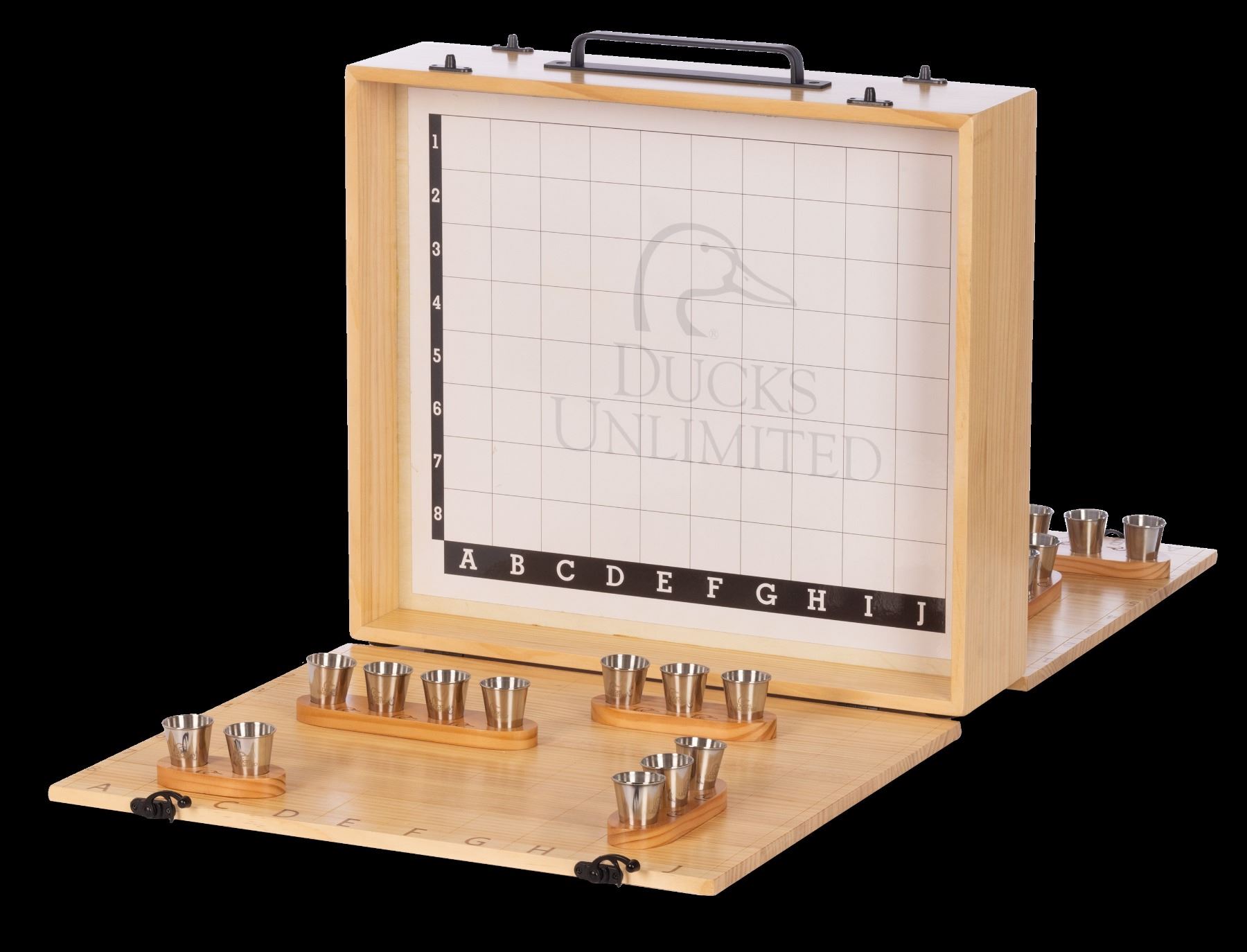 Get ready for a fun and competitive game night with the Battle Shot Game, a creative twist on the classic game of "Battleship." This game is elegantly housed in a stylish wooden box with foam padding, featuring the Ducks Unlimited logo on both sides, black metal hardware, and "Battle Shot" inscribed in the lower corner. It comes complete with 24 durable 1 oz stainless steel shot glasses, 2 dry erase markers with the DU logo, 8 wooden boats designed to hold the shot glasses, and dry erase boards for scorekeeping. Combining strategy and spirited fun, the Battle Shot Game is the perfect addition to any social gathering, ensuring an entertaining and memorable experience for all players.