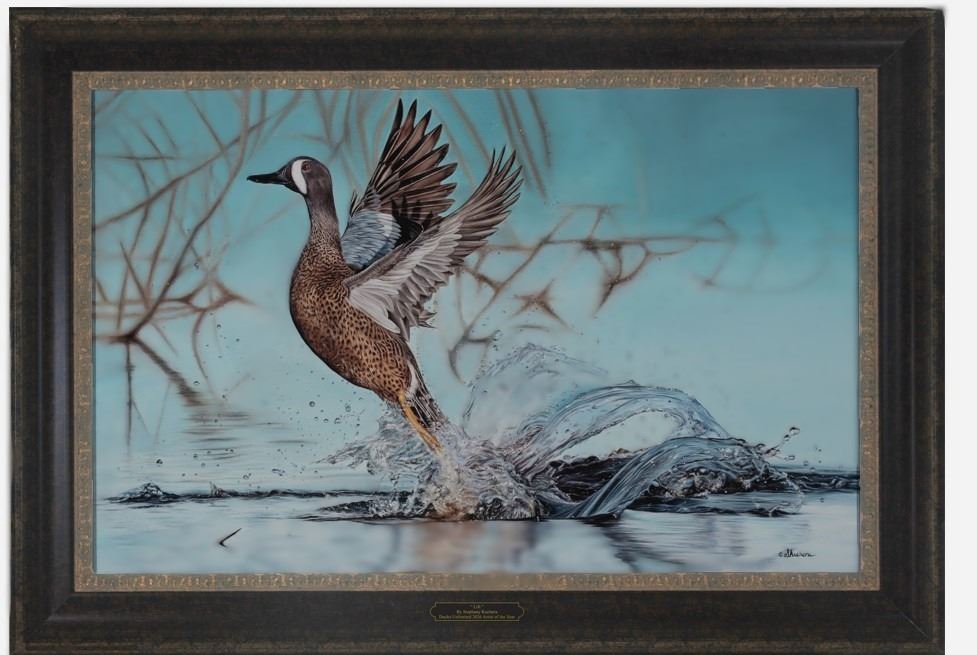 “Lift” is a striking canvas painting that captures the powerful moment a Blue-Winged Teal bursts into flight, with water splashing beneath its wings in vivid, lifelike detail. Created by Stephany Chavez in her debut as Ducks Unlimited's Artist of the Year, this piece reflects both her deep appreciation for wildlife and her talent for dynamic composition. Stephany is the first female Artist of the Year for Ducks Unlimited. The painting is presented on a 21.25” x 33” canvas and includes a custom frame adorned with an Artist of the Year title plate, making it a collectible.
