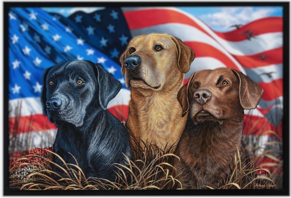 “American Legends” by Anthony Padgett is a powerful tribute to the American spirit and the enduring bond between hunters and their loyal companions. The artwork features three Labrador Retrievers—black, yellow, and chocolate—set against a dynamic backdrop of a billowing American flag. Their amber eyes are focused and alert, capturing a deep sense of loyalty and purpose. In the sky beyond, a flock of ducks soars, adding movement and a sense of the great outdoors. A self-taught artist, Padgett is known for infusing his work with both technical precision and heartfelt meaning, and he proudly supports conservation efforts through his art. This 30” x 20” canvas is a stirring addition to any collection.