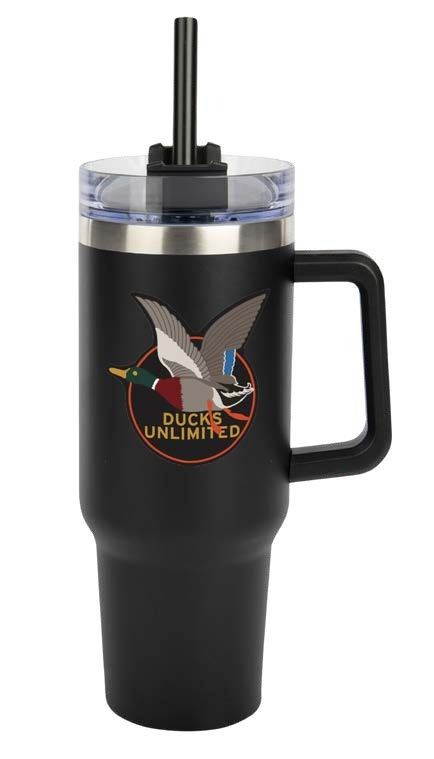 Stainless Steel,double-walled,vacuum insulatedtumbler. Includesplastic handle, screw-on lid with straw.Meets FDArequirements and isBPA free. Black Powder coated with the DU Vintage Logo