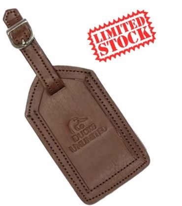 Genuine top grain leather tag. Designed to hold business card and identification information card. Buckle closure. Vertical DU logo embossed on the front. Measures 6.5” x 3.5”