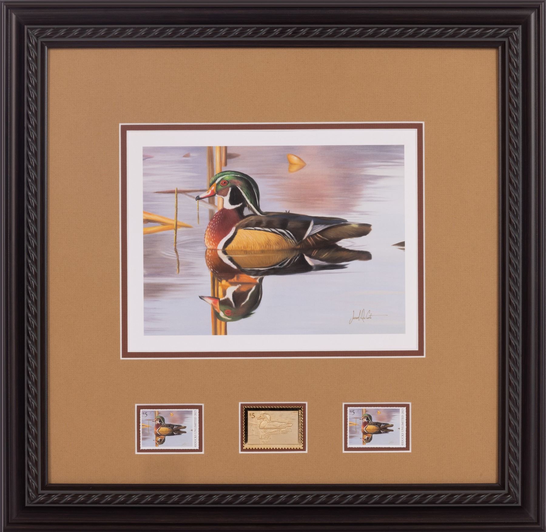 The 2025 DU Stamp Print by Jared DuCote features a captivating artistic portrayal of a wood duck, skillfully crafted by Jared DuCote. This print marks the 42nd image in the DU stamp series, celebrating the enduring beauty of waterfowl through DuCote's artistic lens. Included in the presentation are the matched DU stamp print, a stamp medallion, a mint stamp, and the stamp itself, all artistically signed by Jared DuCote. This collection not only serves as a testament to DuCote's talent and dedication but also supports Ducks Unlimited's mission of conserving wetlands and wildlife habitats crucial for migratory birds. The 2025 DU Stamp Print by Jared DuCote is a prized addition for collectors and enthusiasts passionate about wildlife art and conservation.