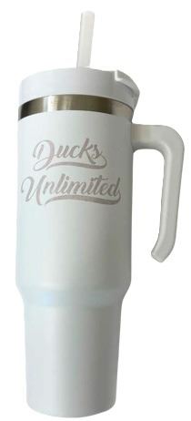 40oz tumbler features Ducks Unlimited scripted on both sides of the tumbler in khaki White tumbler with matching top and straw BPA free