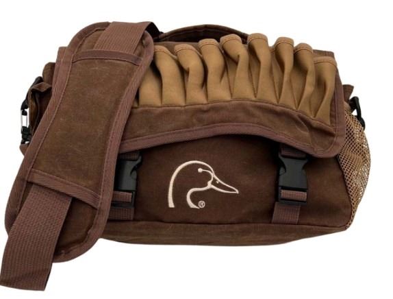 Rugged waxed canvas in dark brown with embroidered duckhead logo. Features two zippered mesh pockets. Velcro closure front accessory pocket. Removable internal duck call organizer. Front flap panel offers 12 neoprene duck call/shell/choke tube slots. Measures 12" x 8" x 7.5"