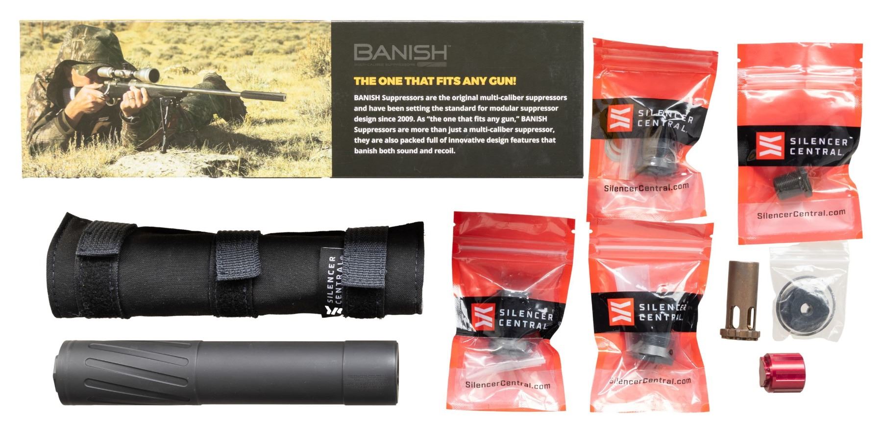 SOUND SUPPRESSOR. Cal. 30. S#G30G-010853. 8.2" Titanium, 30 caliber sound suppressor w/ 11 baffles. Black Cerakote finish. Currently outfitted w/ direct thread titanium 5/8"x24 muzzle brake adapter. Completely user serviceable. Currently sporting Silencer Central heat wrap. UNATTACHED ACCESSORIES: Factory box, Silencer Central heat sleeve, 1 new 1/2"x28 to 5/8"x24 thread adapter, 3 new 1/2"x28 Banish 30 Gold muzzle brakes, 1 1/2"x28 piston, 1 red anodized disassembly tool. CONDITION: All aspects indicate it has never been mounted or fired. Most included parts remain in sealed packaging. NATIONAL FIREARMS ACT SOUND SUPPRESSOR REQUIRING BATF TRANSFER BEFORE TAKING POSSESSION. FULLY TRANSFERABLE. (03-2066/JZ). CLASS 3. MODERN. $600-900.