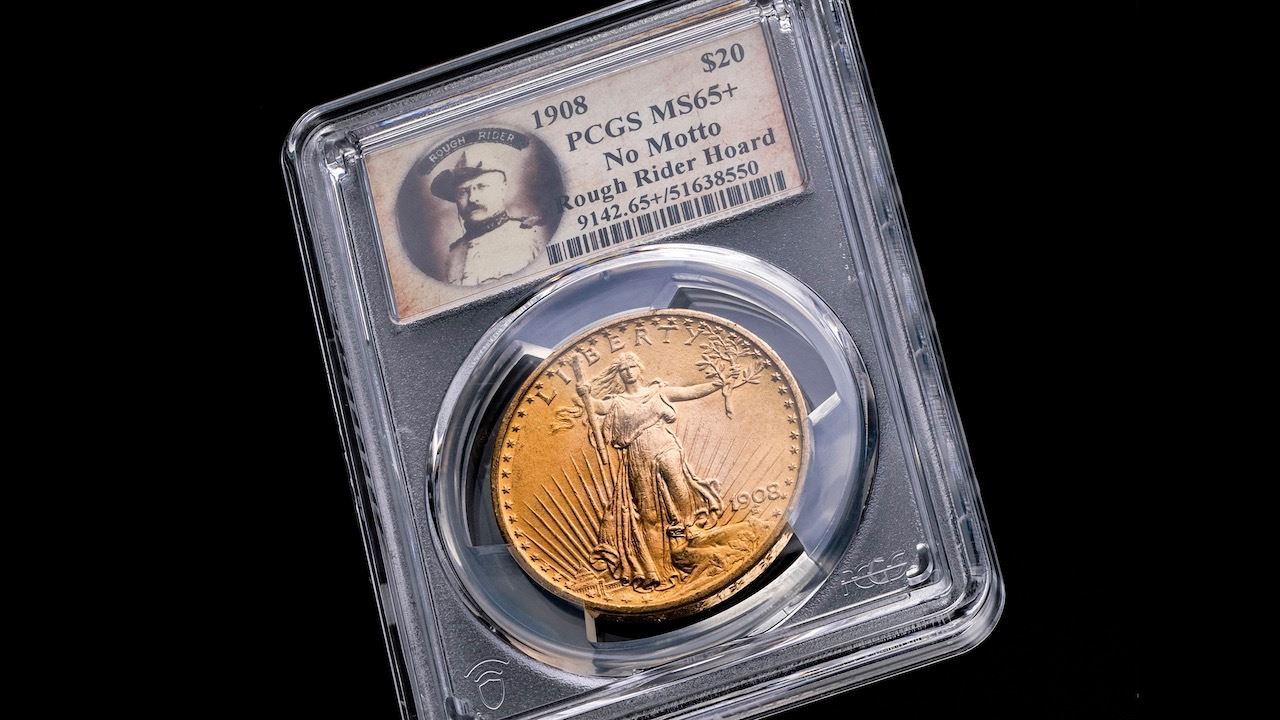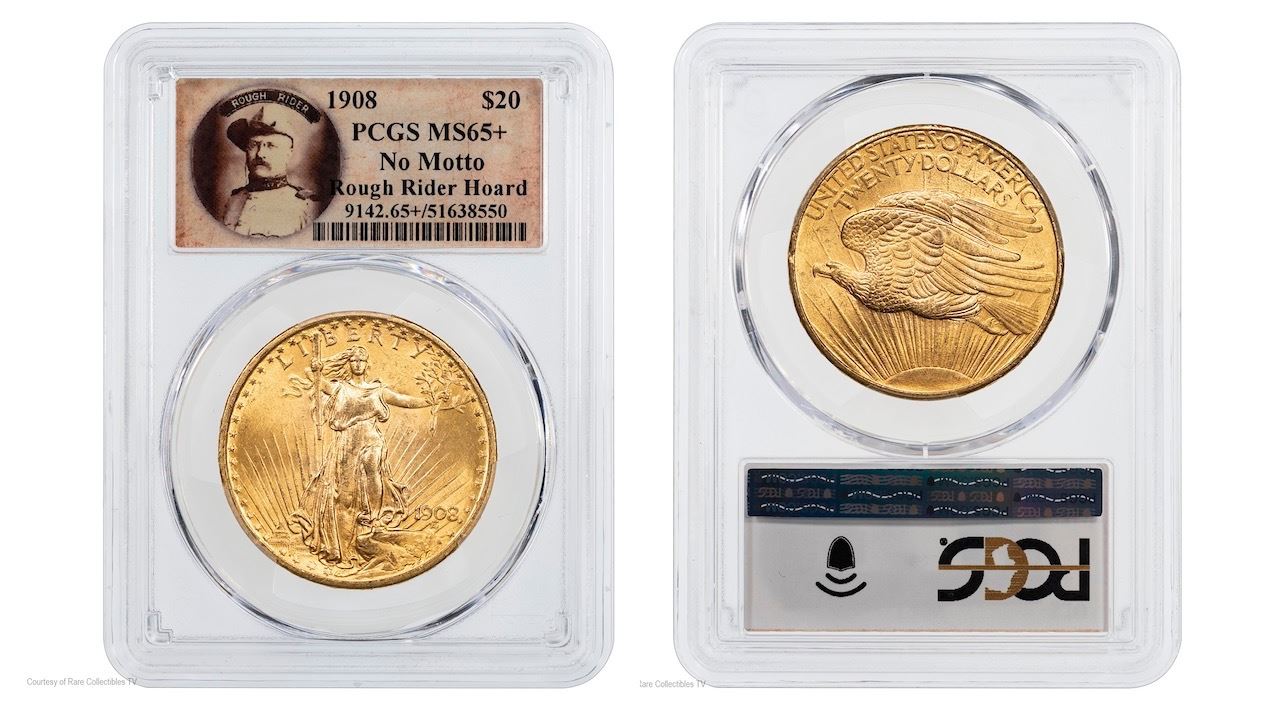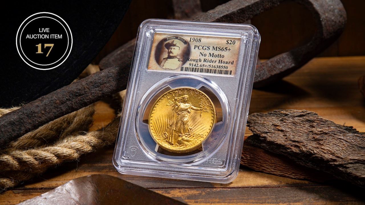 Lot 17 1908 ST. GAUDENS “NO MOTTO” ROUGH RIDER HOARD GOLD DOUBLE EAGLE