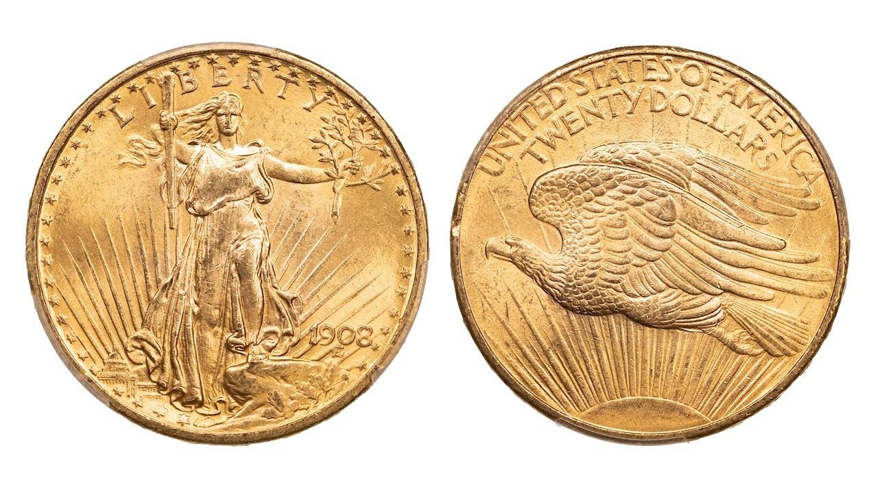 This spectacular 1908 $20 Gold Double Eagle contains nearly one full ounce of gold and represents one of the