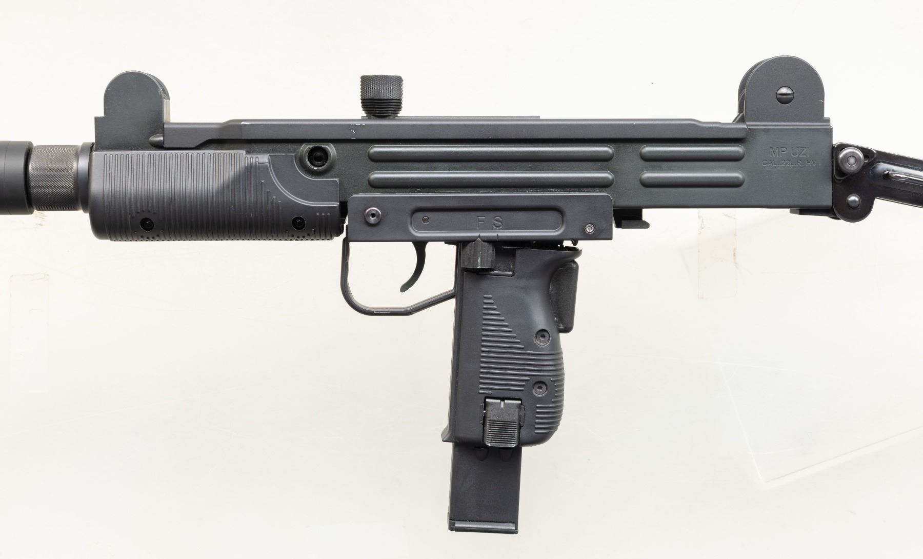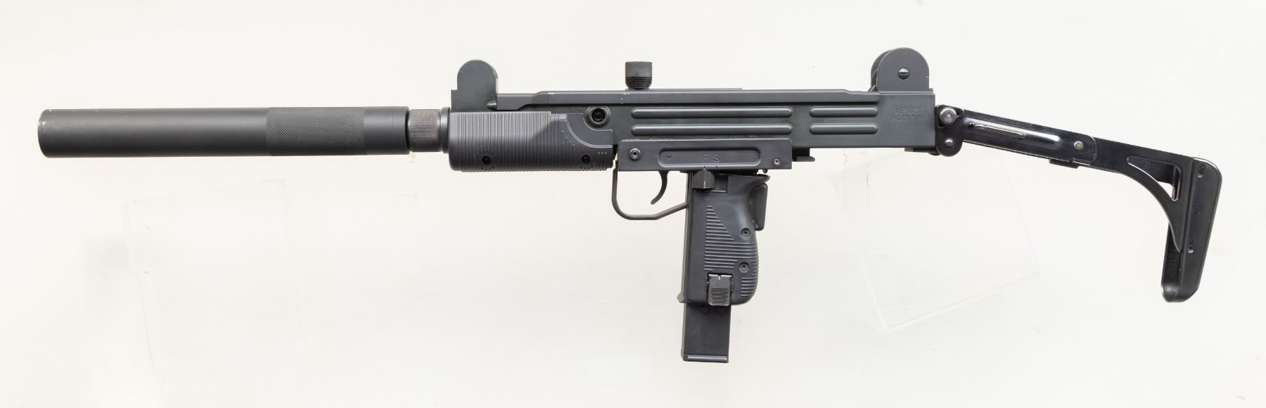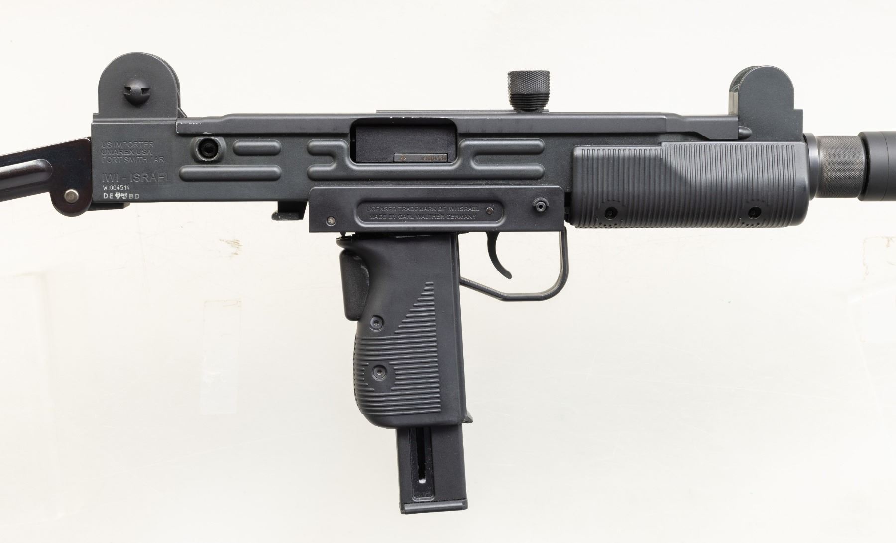 Cal. 22 LR. S# W1004514. Mfg. by Walther Arms in Germany & Imported by Umarex of Fort Smith, AR. Bbl. 17" having a barrel shroud similar to suppressor. Matte black finish. Black composite grip assembly. Folding steel stock. MAGS: 1 -10 rd. UNATTACHED ACCESSORIES: matching factory box & manual. CONDITION: gunsmith attention needed as plastic grip assembly is broken & separating. Near excellent metal & composite finish with light handling marks. Near excellent rifling. (25-5463/MD). MODERN. $200-400.