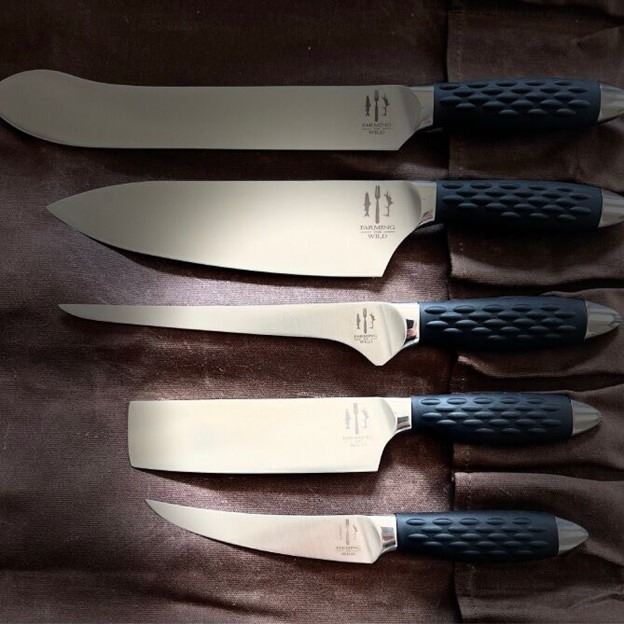 All blades etched with Mike Robinson’s Farming the Wild logo.