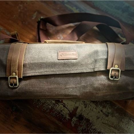 Knives are secured in a wax canvas and leather knife roll bag.