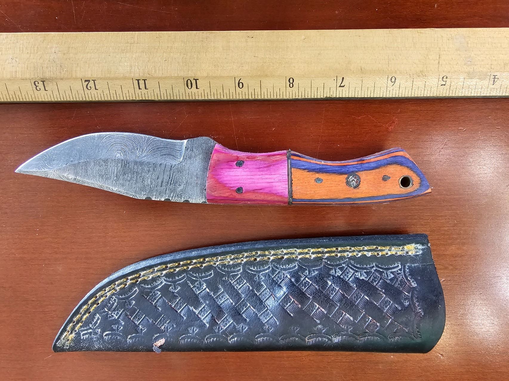 Lot 227 Hand Forged Damascus Steel Knife w/ Leather Sheath