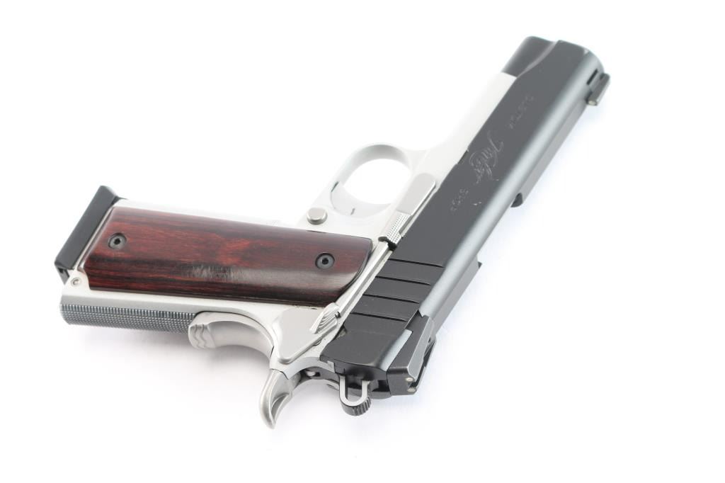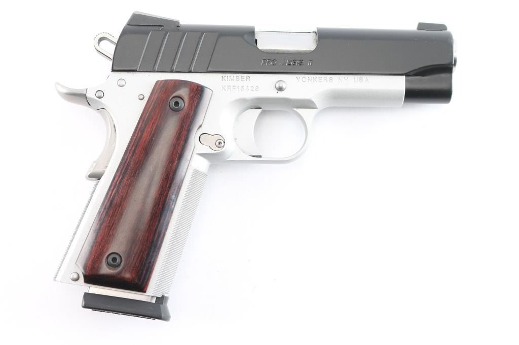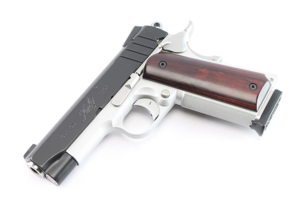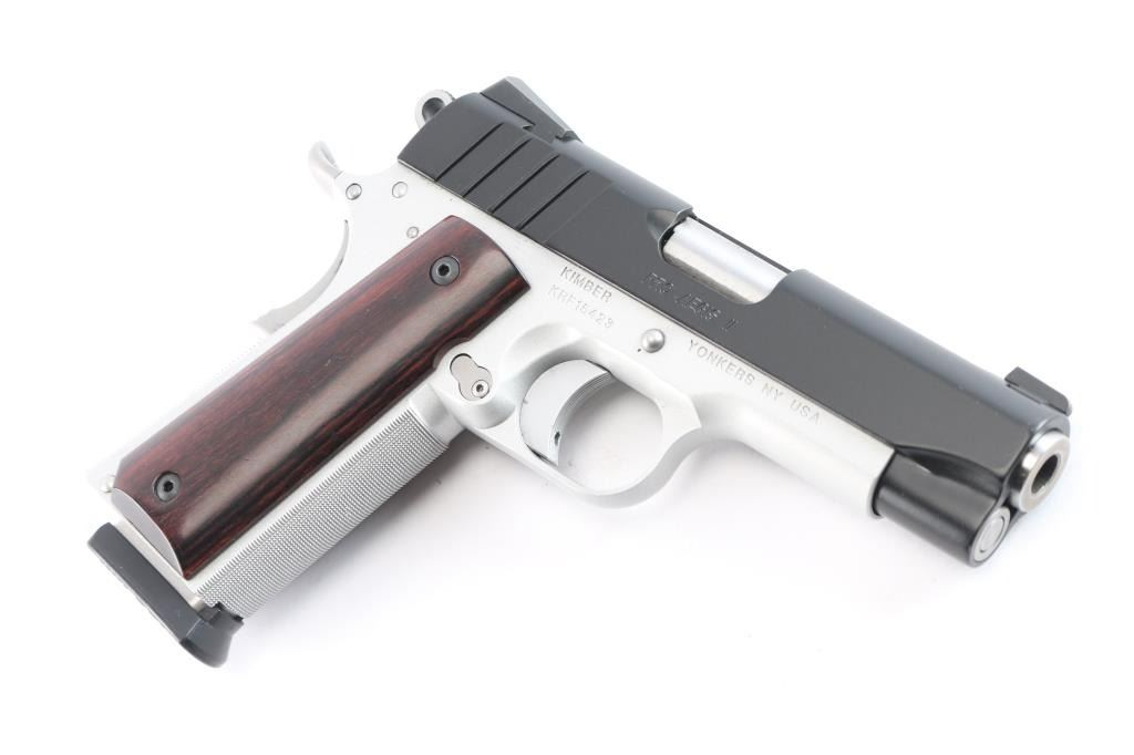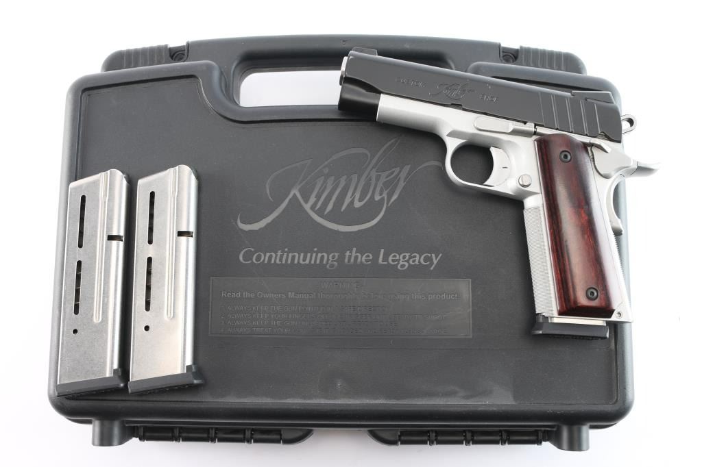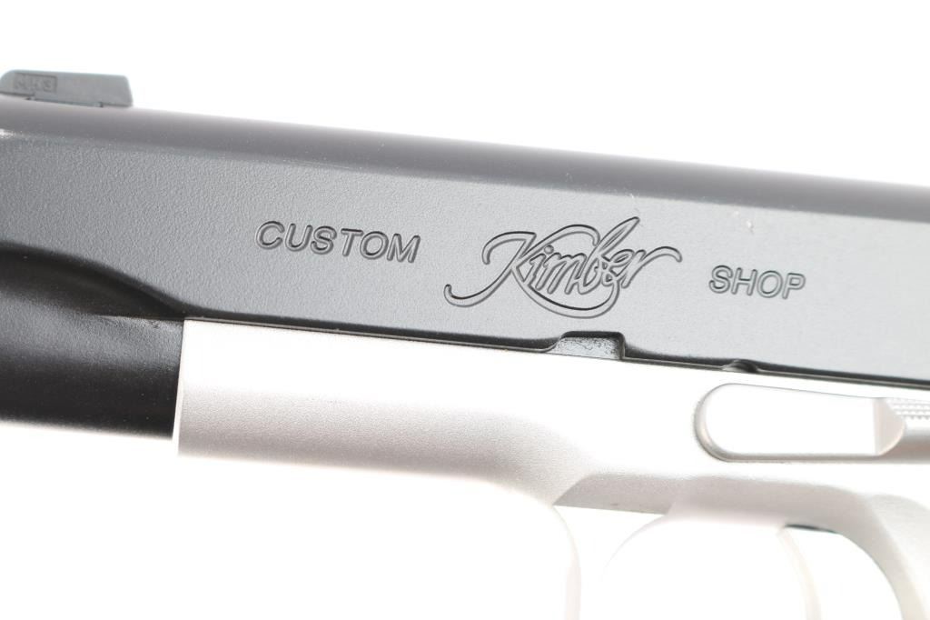 Kimber Custom Shop small, lightweight semi-automatic pistol chambered in 9mm. Matte black steel slide with KimPro II frame finish, MH3, 3 dot night sights, aluminum frame with satin silver finish, fine checkered front strap, flat knurled main spring housing, beavertail grip safety with memory bump, adjustable solid aluminum match grade trigger, 4" steel match grade barrel Twist rate (left hand): 16, Thumb safety, full length guide rod, serrated skeletonized hammer, smooth rosewood grips. Wilson Combat magazine. Bore is pristine, pistol is in like new condition. Comes in factory hard case with matching label, two spare Wilson Combat magazines, manual and lock. Also comes with box of accessories including two Galco holsters, one black leather, one suede, DeSantis black leather belt holster, two factory stainless magazines, two Mitchell 10-rd extended magazines, one Colt magazine, one KimPro magazine, two extended floor plate magazines, factory bushing tool, four extended magazine floor plates, Tru-Dot rear night sight. The following grips are all Altamont. White pearl NRA grips, rosewood grips, white pearl NRA grips, black checkered grips, smooth white pearl, smooth fancy walnut grips and white pearl grips with S&W medallions. They come with set of grip screws & bushings, blue & stainless.