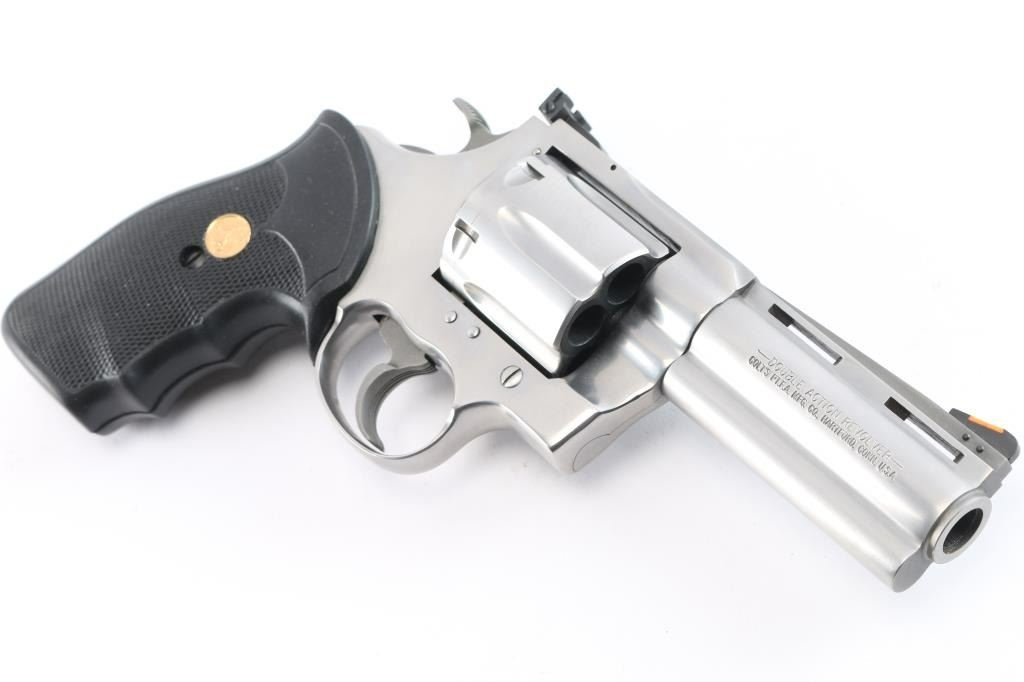 American made premium large frame stainless steel double action revolver chambered in .45 Long Colt, manufactured circa 1994 in Hartford, CT. Revolver features a polished stainless finish, 4" vent ribbed barrel, shrouded ejector rod, full underlug, pinned ramp front sight with orange insert, micrometer adjustable square notch rear sight with white outline, fluted six-shot cylinder, partially serrated wide curved trigger, flat top frame, frame mounted firing pin, transfer bar safety, serrated wide hammer spur, and two-piece checkered black rubber finger groove grips with gold-colored colt medallions. Revolver's original stainless finish retained is approximately 99% with only superficial scratches, and a light drag line on the cylinder. Metal displays no rust or deformation. Action is super smooth and crisp with a very good lock-up. The bore is bright with strong rifling, and the cylinder chambers are also excellent. Barrel and chambers need to be cleaned. The rubber grips are excellent.